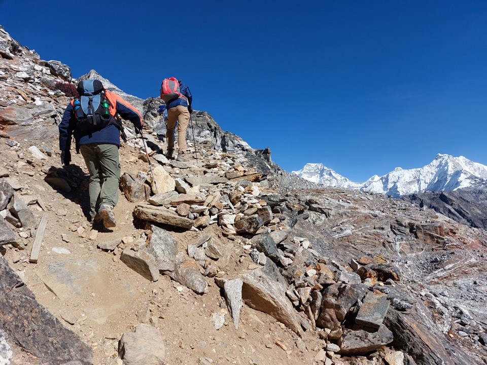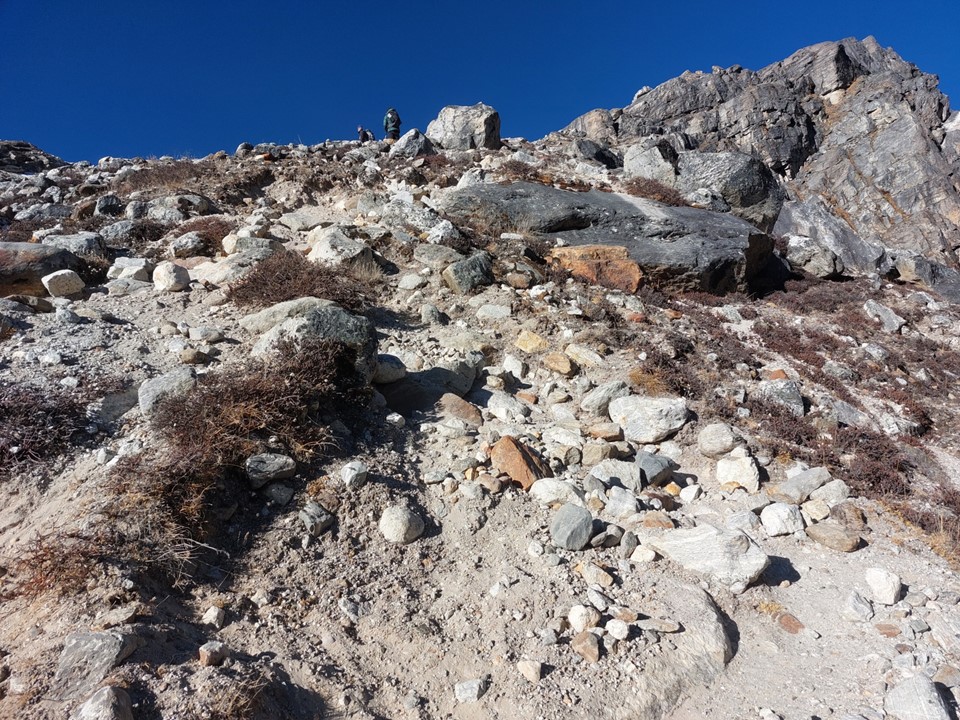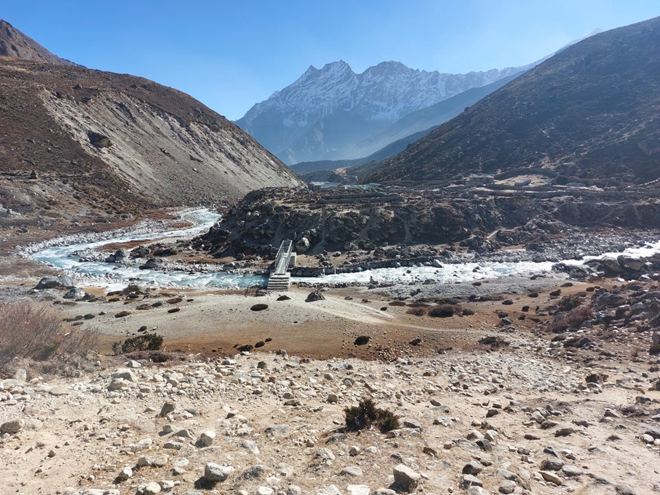 The hike up Gokyo Ri starts with a crossing of the stream flowing into the lake, and then begins zig-zagging up the hill.
