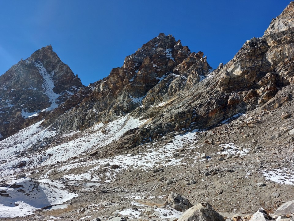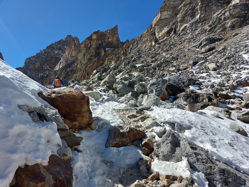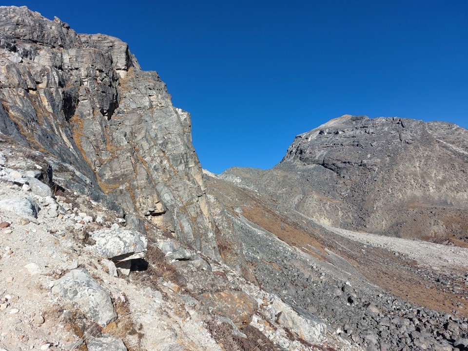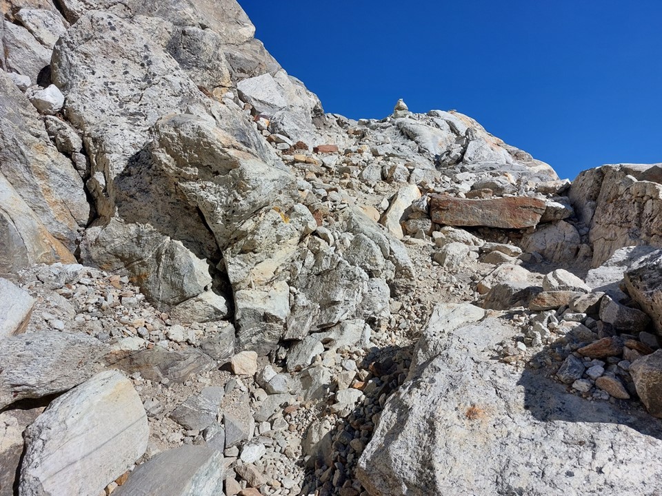 As with the other passes, the west side was steeper and less stable – but this loose ground is similar to my home terrain, and I made quick progress down the top section.
