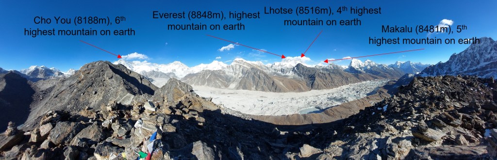 To the east I could see Everest (highest mountain on earth), Lhotse (4th highest mountain on earth), Makalu (5th highest mountain on earth), Cholaste and Tabuche.