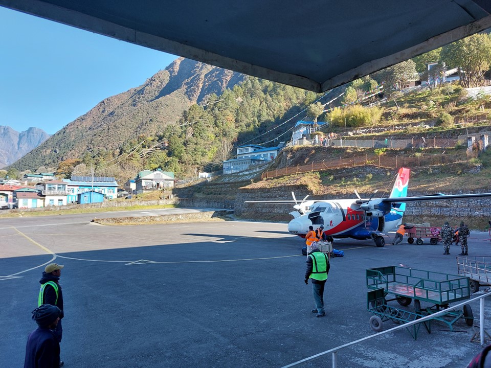 Our incoming flight happened to be a cargo one too – but eventually we were on. It was a Summit Air L410. The flight safety talk for this one is roughly a minute – which is ironic seeing as Lukla flights have a higher accident rate than practically anywhere else, although I guess they rarely have survivors, so it doesn’t really matter!