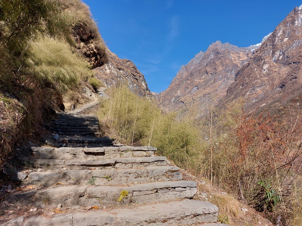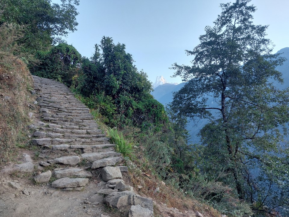 I had an early breakfast, and set off nice and early. The hike starts with a very steep staircase. By the time I hit 1km distance, I had already gained 235m in elevation. With 10 hours to go till sunset, it was going to be hard, but doable. I took a photo of my GPS and posted it as a whatsapp status with a caption “If this gradient is sustained, I’ll be on top of Annapurna in 28km!” I had been in Nepal long enough to know that there would be plenty of downhill on the route. Not to mention – when you start at 1750m and the high point is 4100m, it doesn’t take amazing maths skills to know that 4.2km elevation gain and loss means you will have plenty of up and down along the way.