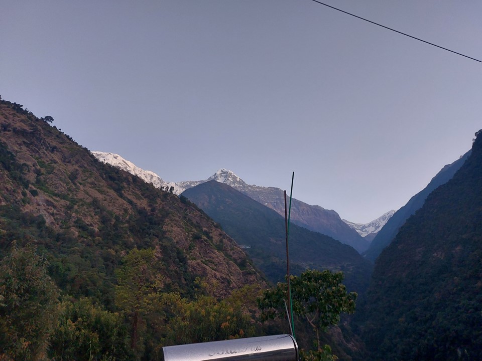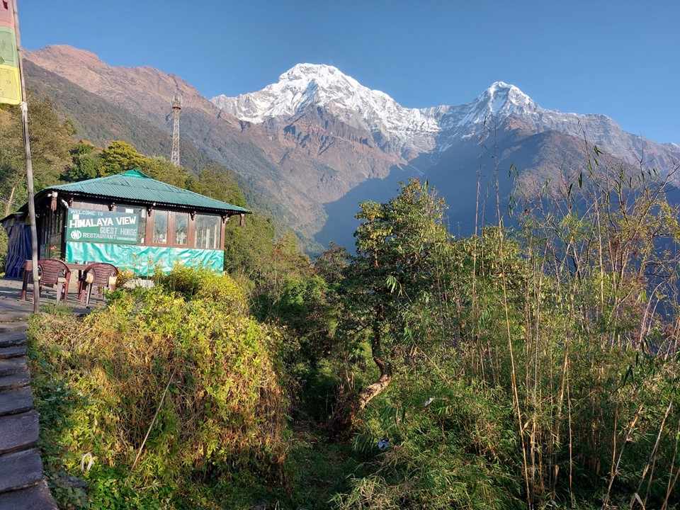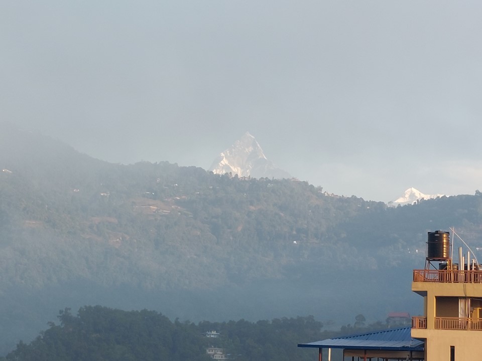 I woke up to a cloudy morning – but in the distance Machhapuchhare was sticking its head out above the nearby hill. I was happy to see the mountain again!