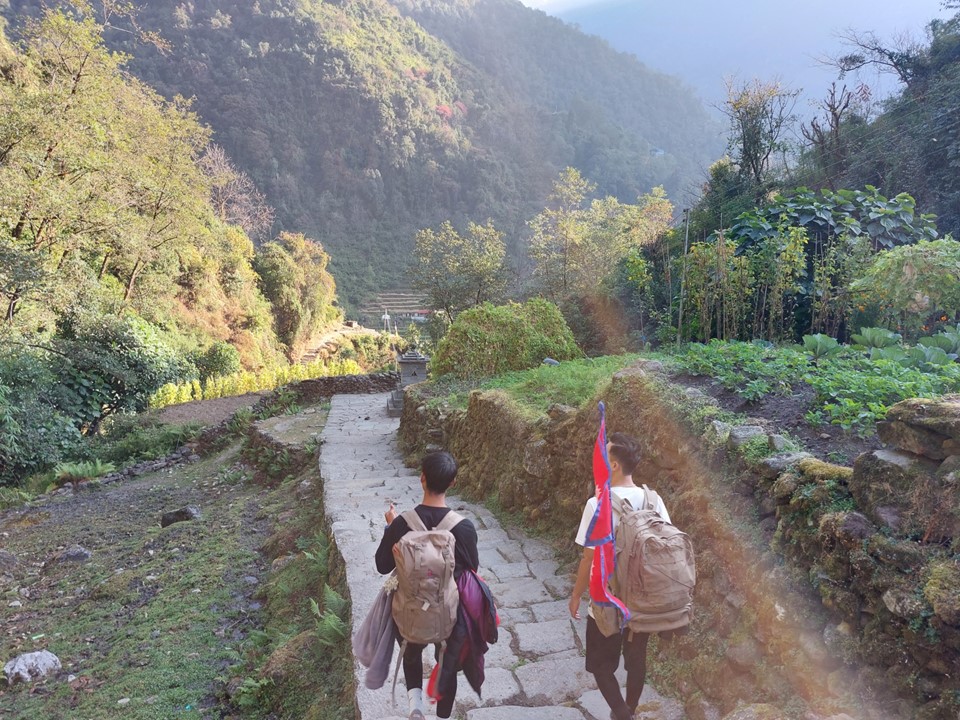 We eventually arrived at the end of the road. I thanked the driver, and completely forgetting about my snacks, I grabbed my pack and started the walk to Jhinu Danda. The two guys from Kathmandu walked with me, they spoke very little English – so we didn’t talk much. Then again – I only know one word of their language, so they are doing far better than I am!