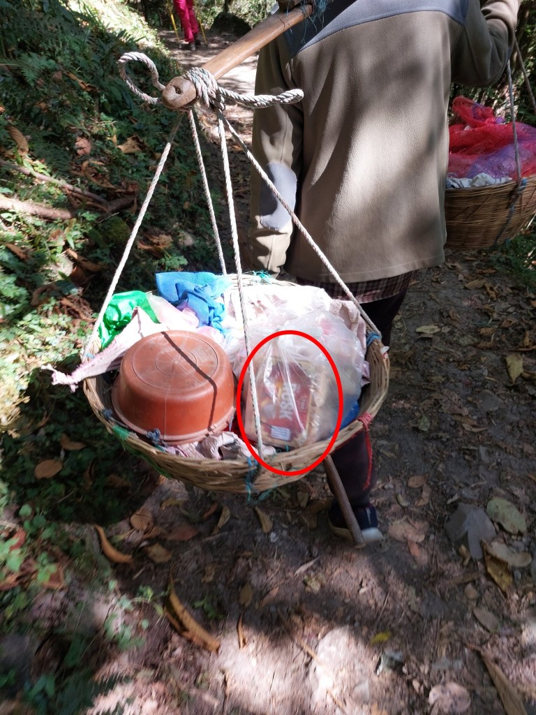 I saw a porter walking with some snacks, which would have been on their way to one of the tea houses. I noticed he had a box of rusks in there – what are the odds!