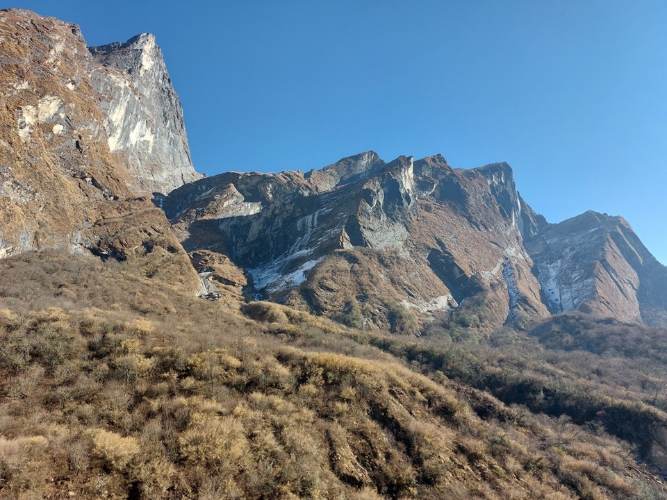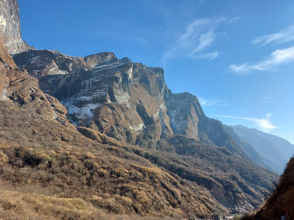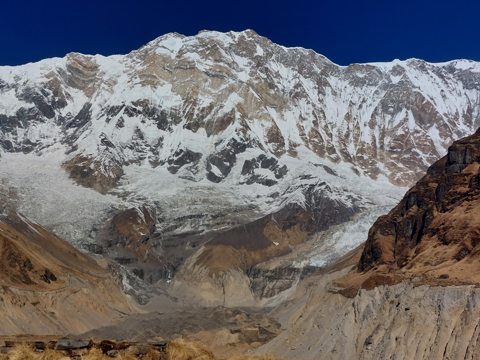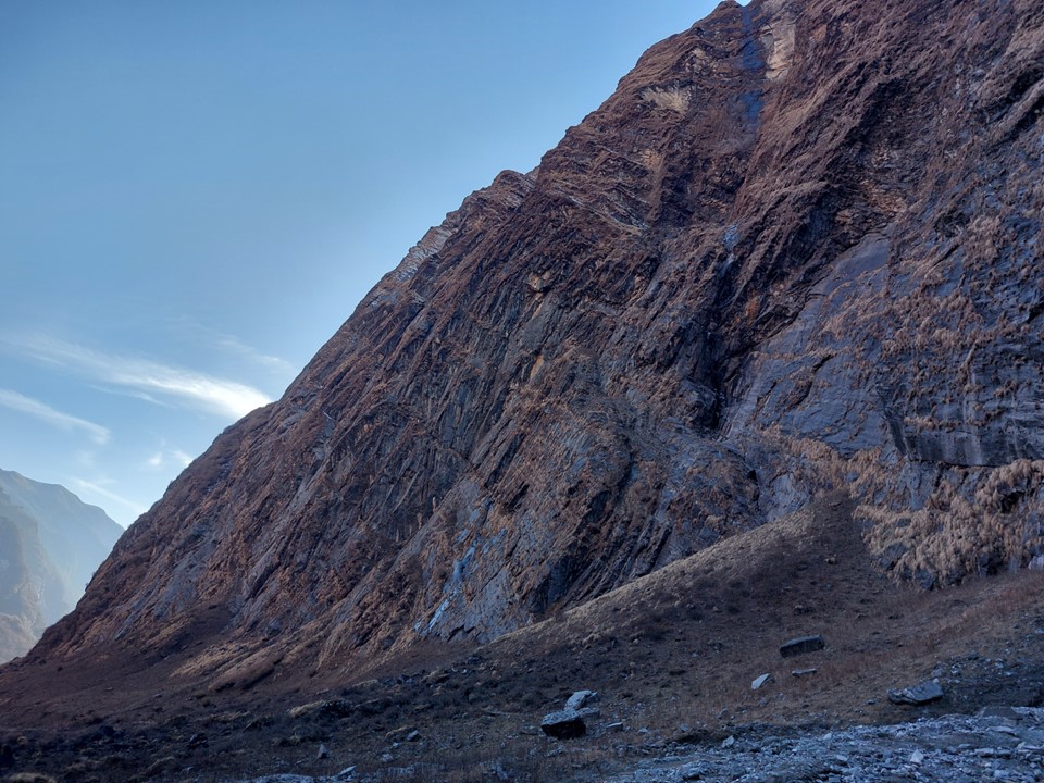 While Annapurna has been climbed from this side, the usual basecamp would be on the other side of the mountain. Very few climbers have ever climbed the mountain from this side. With a 4km high mountain face, it is one of the largest mountain faces on earth – as always, photos do it no justice.