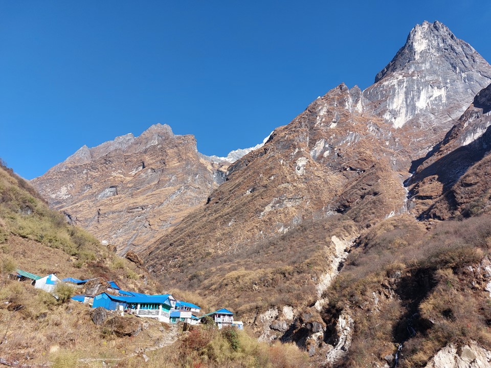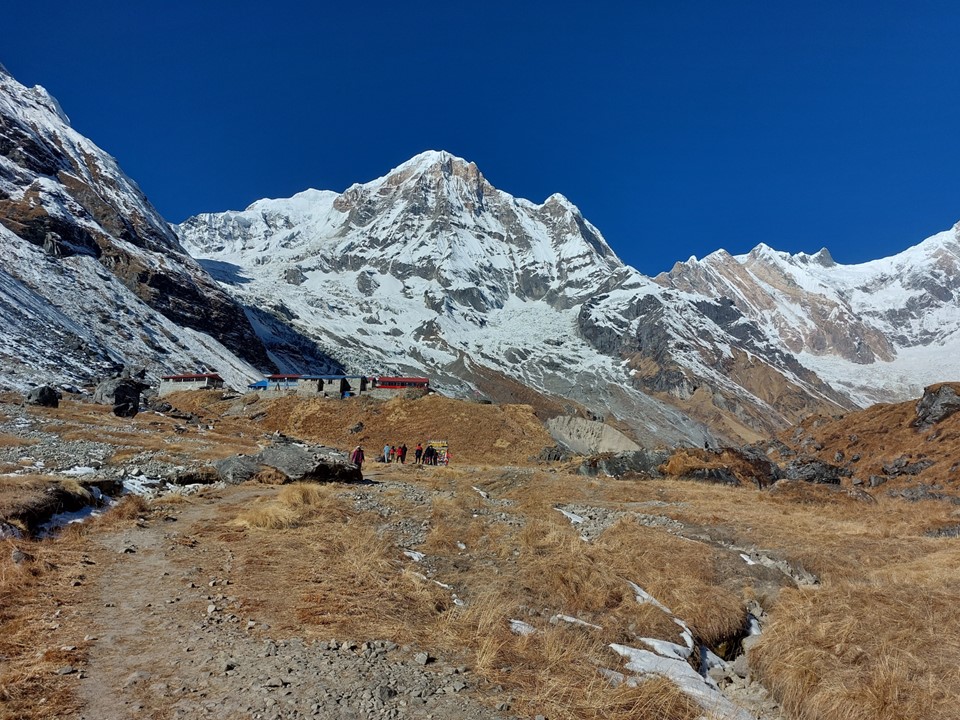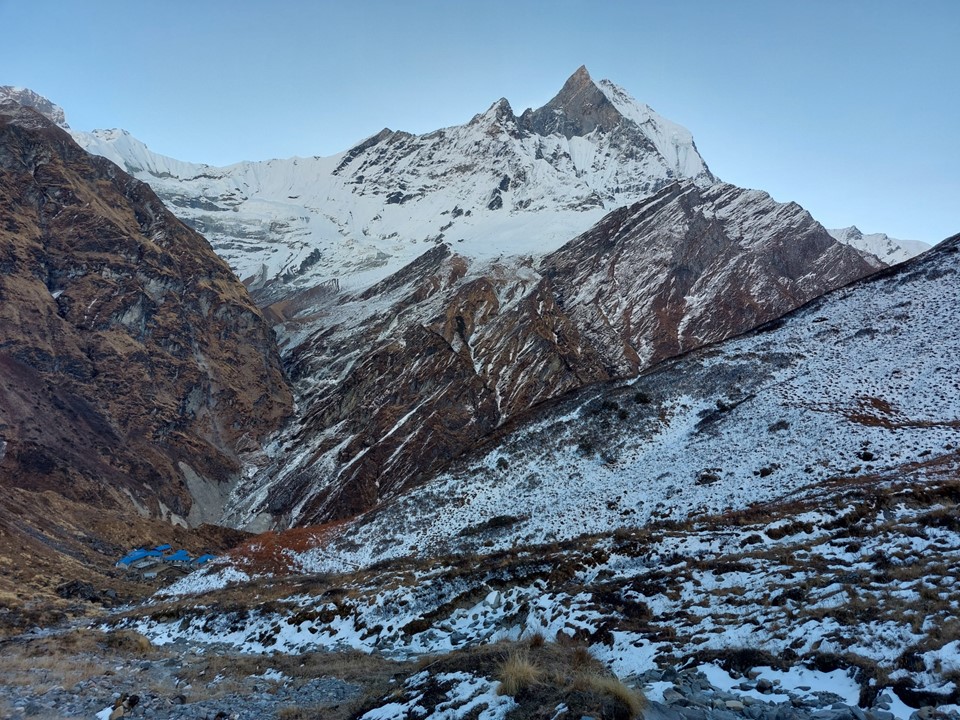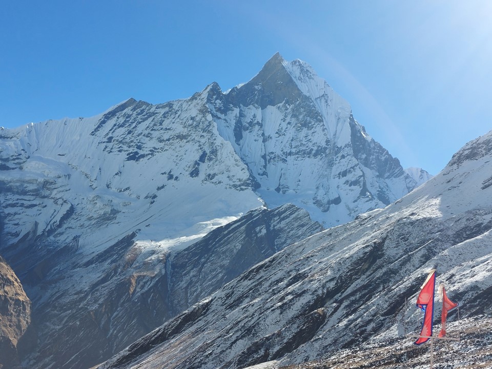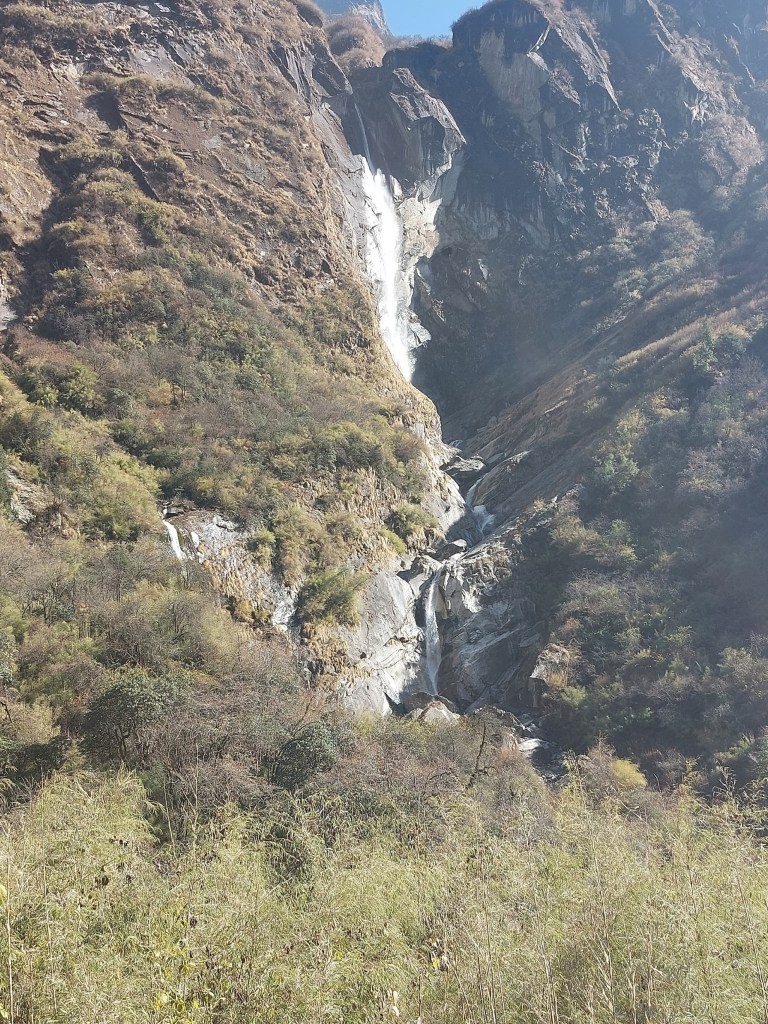 While Annapurna has been climbed from this side, the usual basecamp would be on the other side of the mountain. Very few climbers have ever climbed the mountain from this side. With a 4km high mountain face, it is one of the largest mountain faces on earth – as always, photos do it no justice.