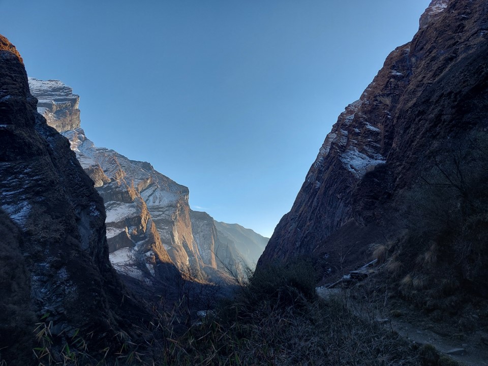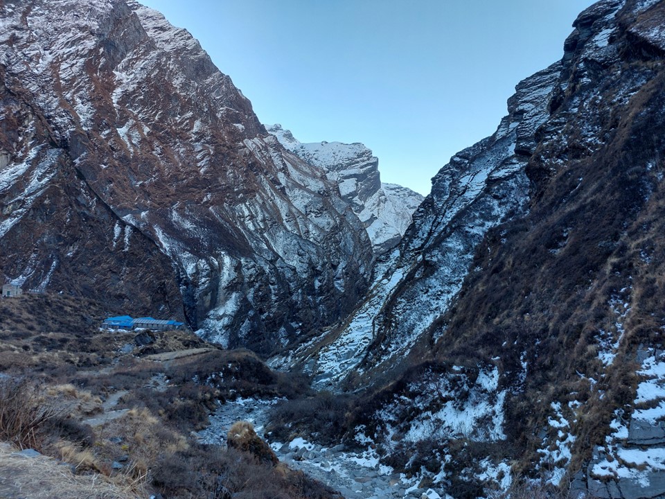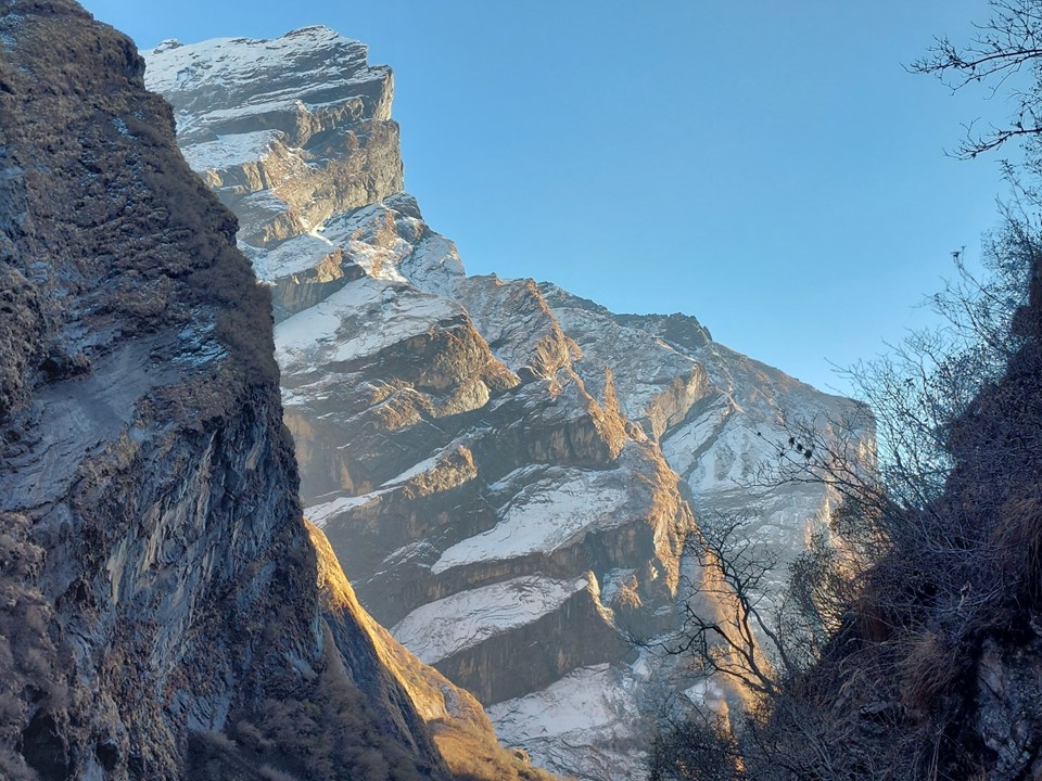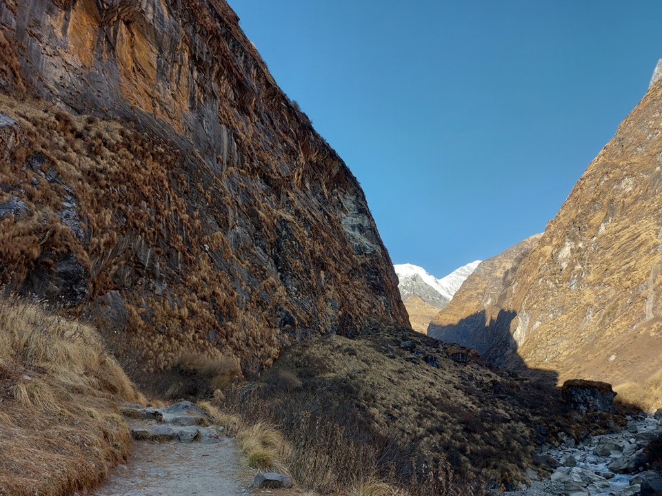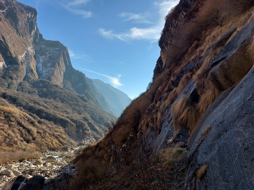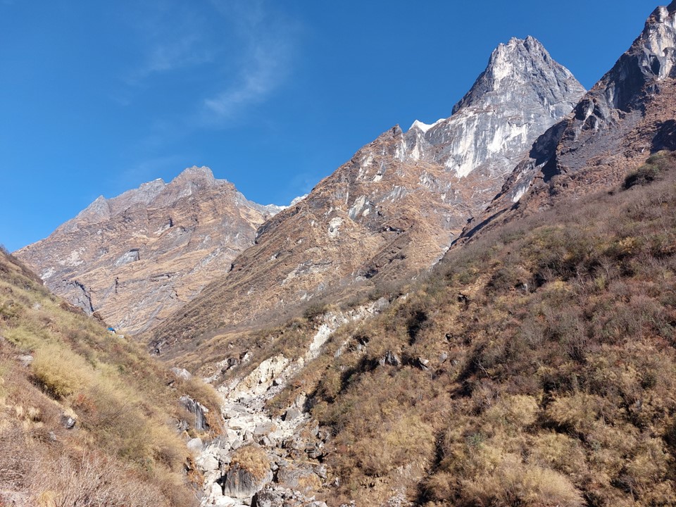 The valley becomes very narrow. This section before Machhapuchhare Basecamp is subject to avalanches when its snowing – the avalanche sweeps from the mountain above and drops off the cliffs. The trail is frequently closed as a result, although not usually during the dry season. There was barely any snow on this ridge at all, not that I could see that from below.