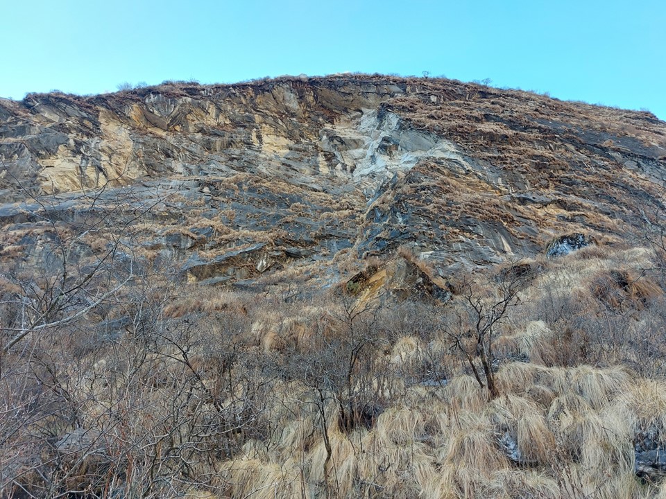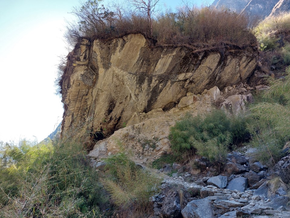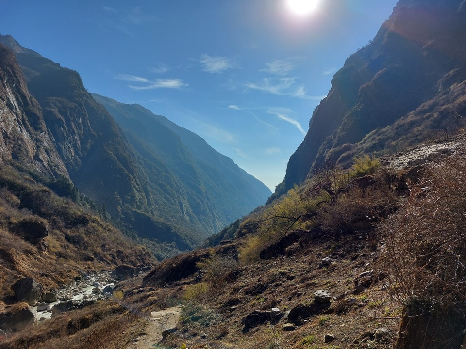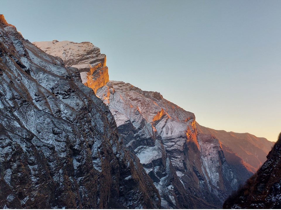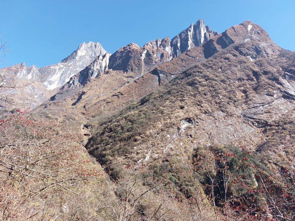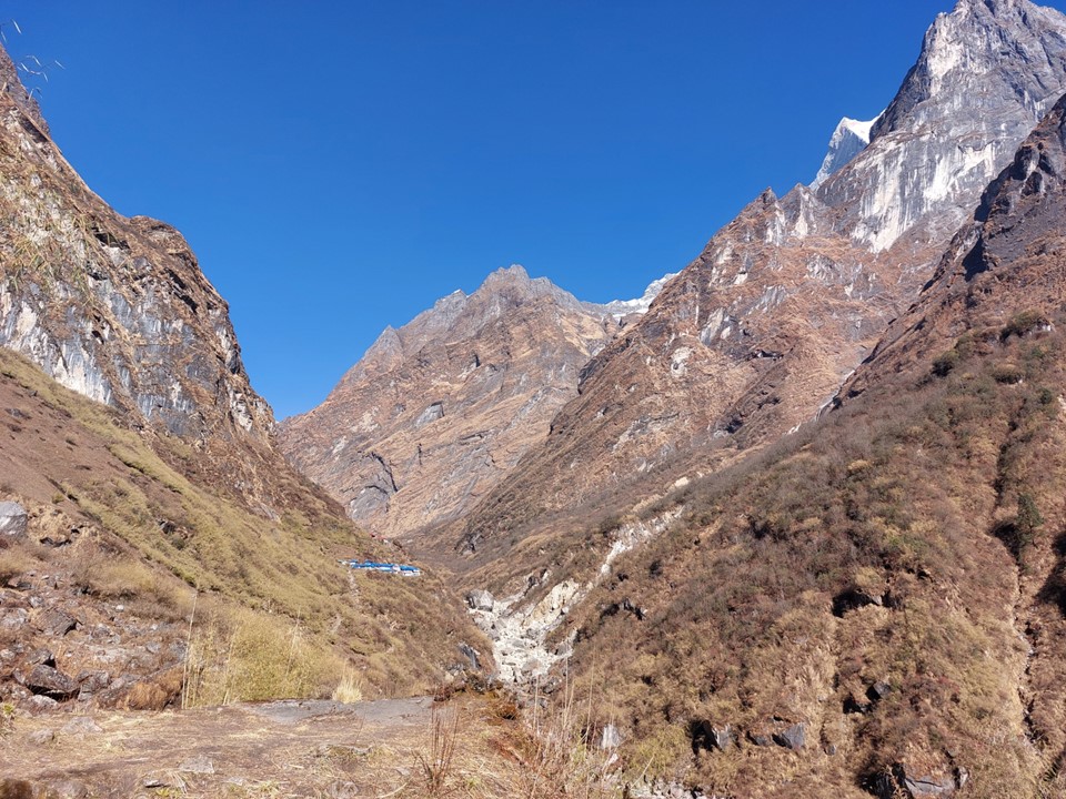 The valley becomes very narrow. This section before Machhapuchhare Basecamp is subject to avalanches when its snowing – the avalanche sweeps from the mountain above and drops off the cliffs. The trail is frequently closed as a result, although not usually during the dry season. There was barely any snow on this ridge at all, not that I could see that from below.