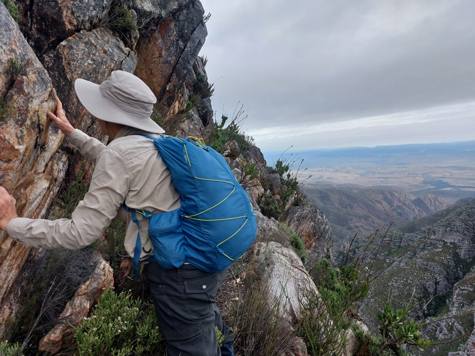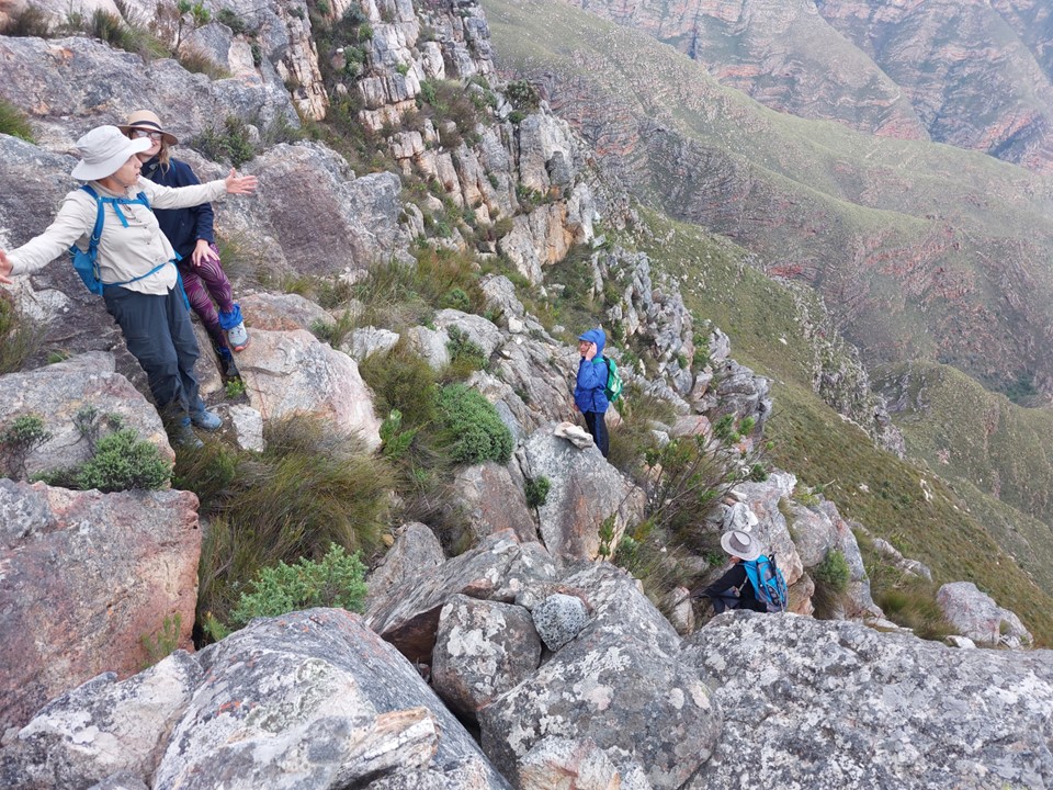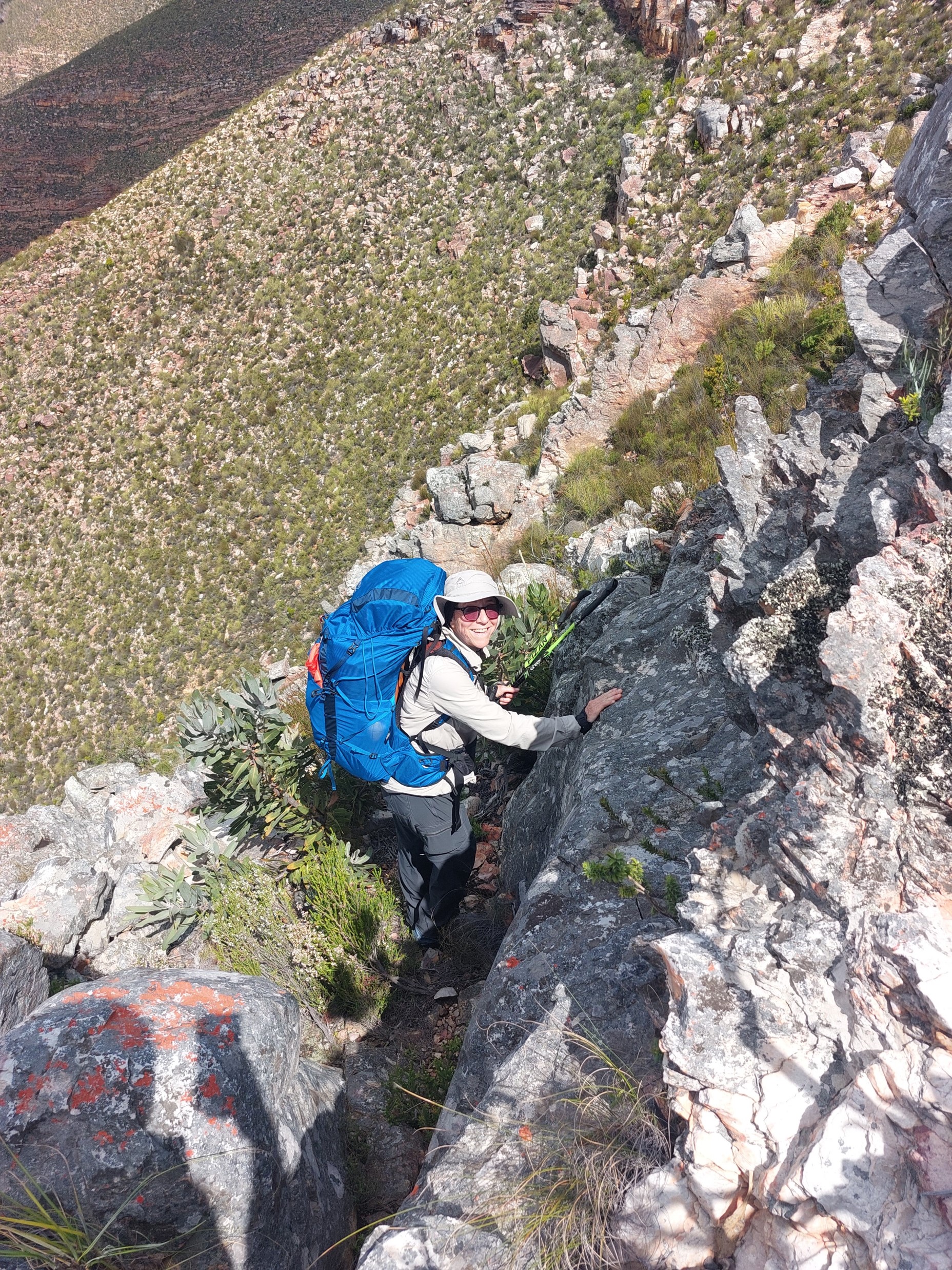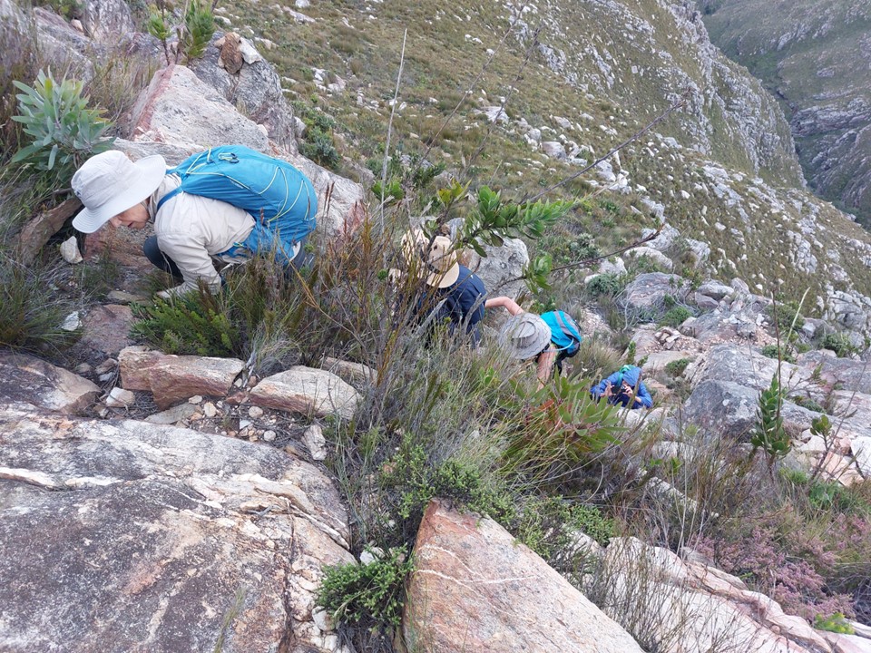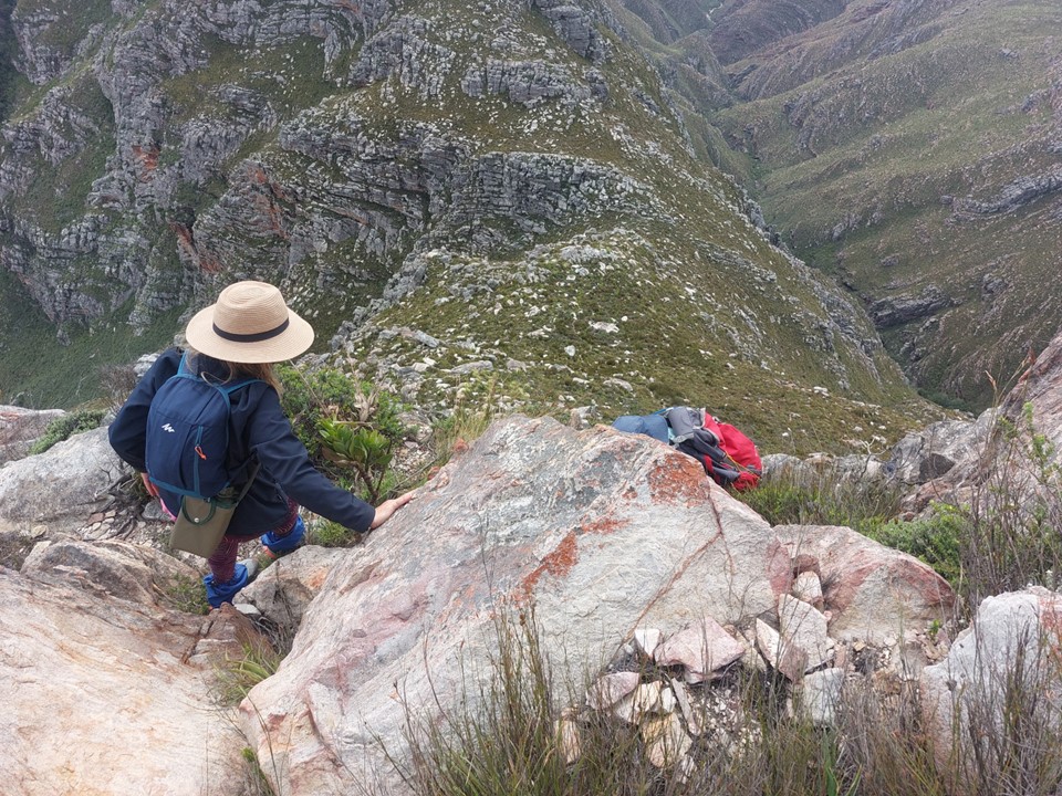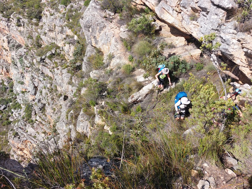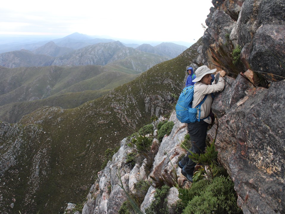 As we neared Tokoloshe Cave, the ground suddenly started getting more exposed. As is often the case in the Cape Fold Mountains, one has to walk on narrow exposed ledges where a fall could be serious. As Andrew would call it – the DFU Zone (Don’t Mess Up Zone).