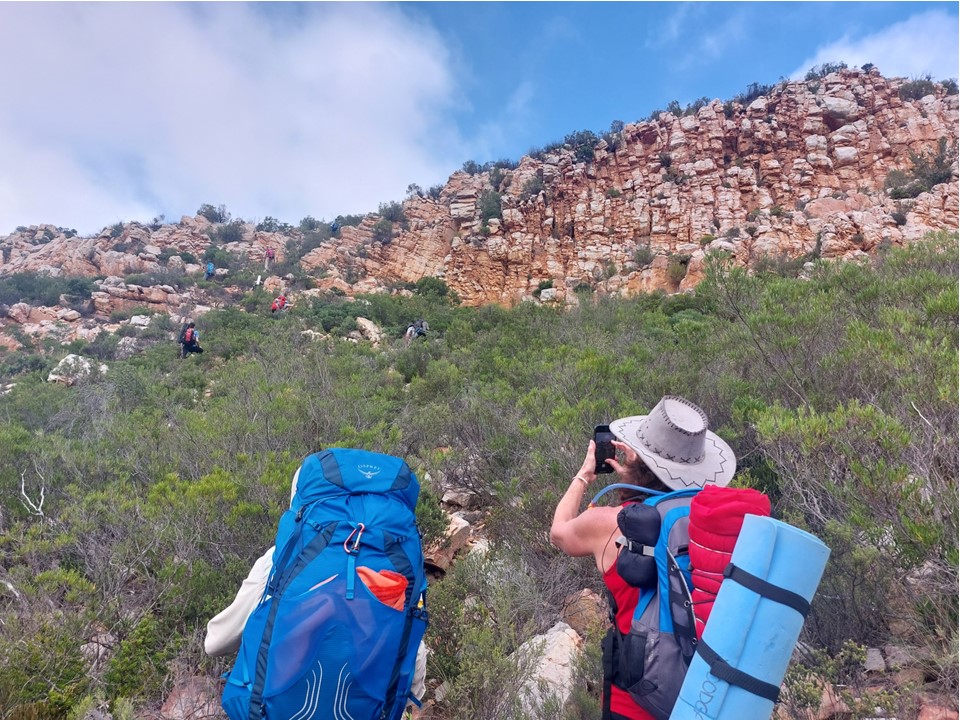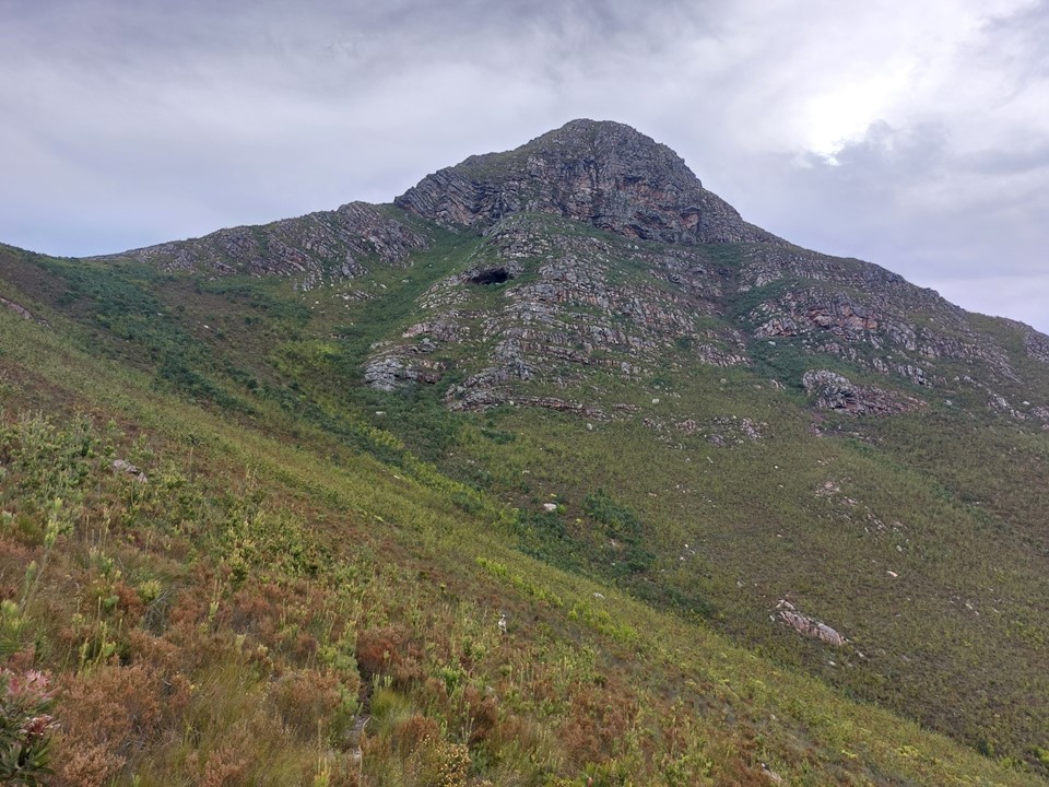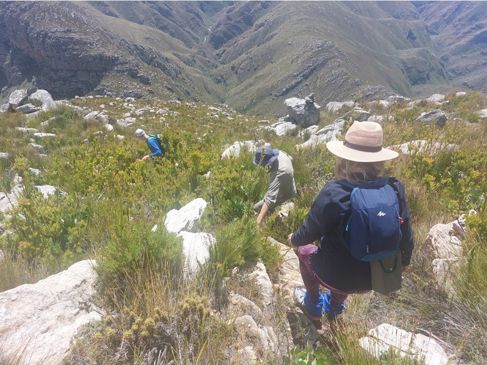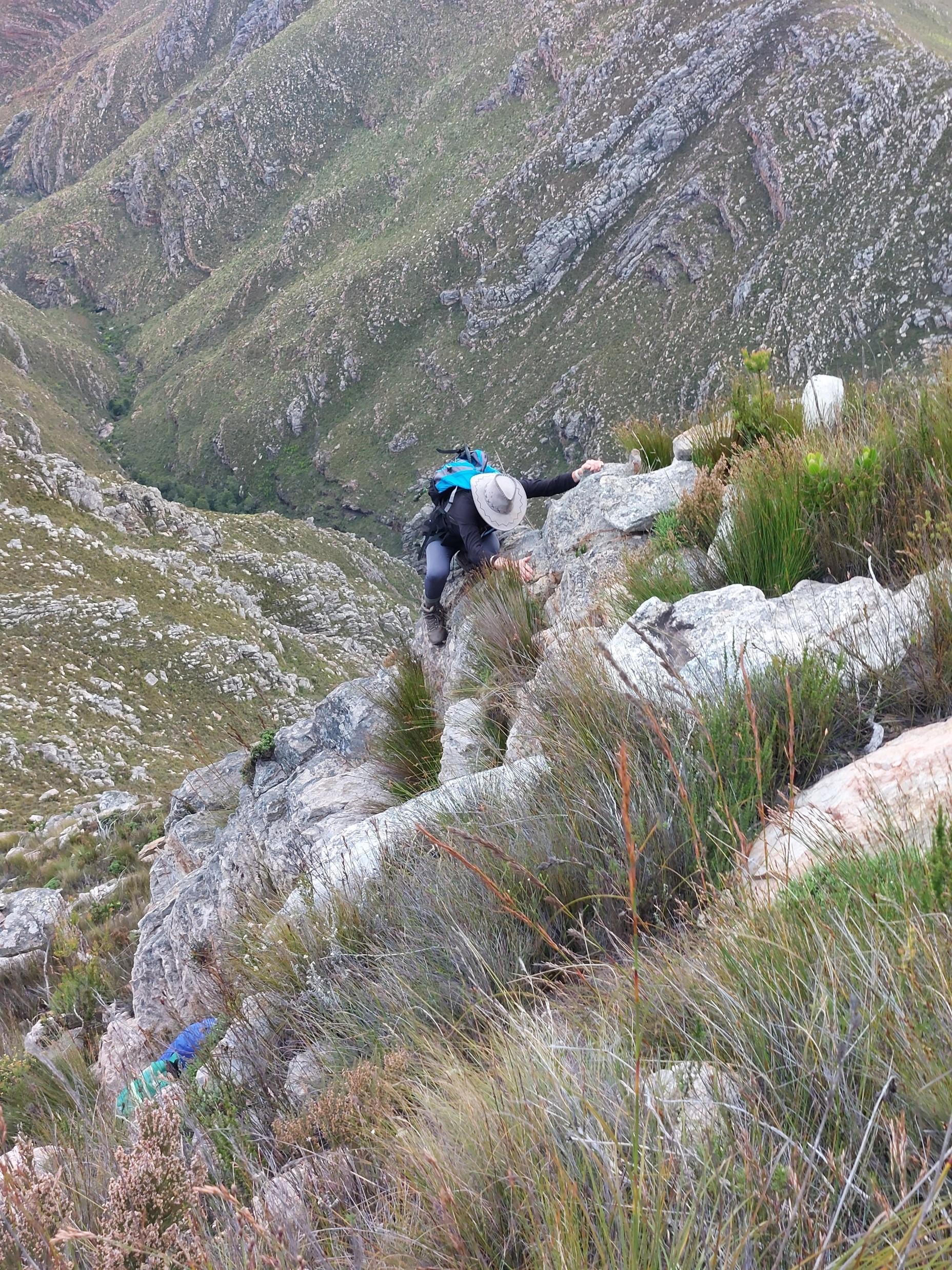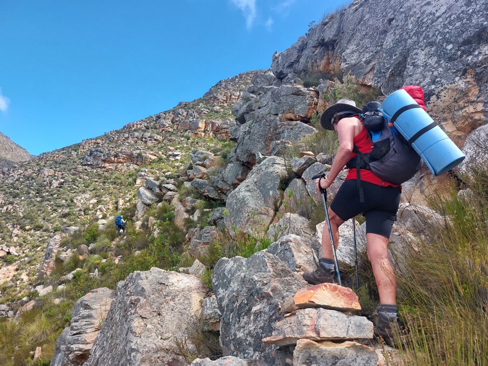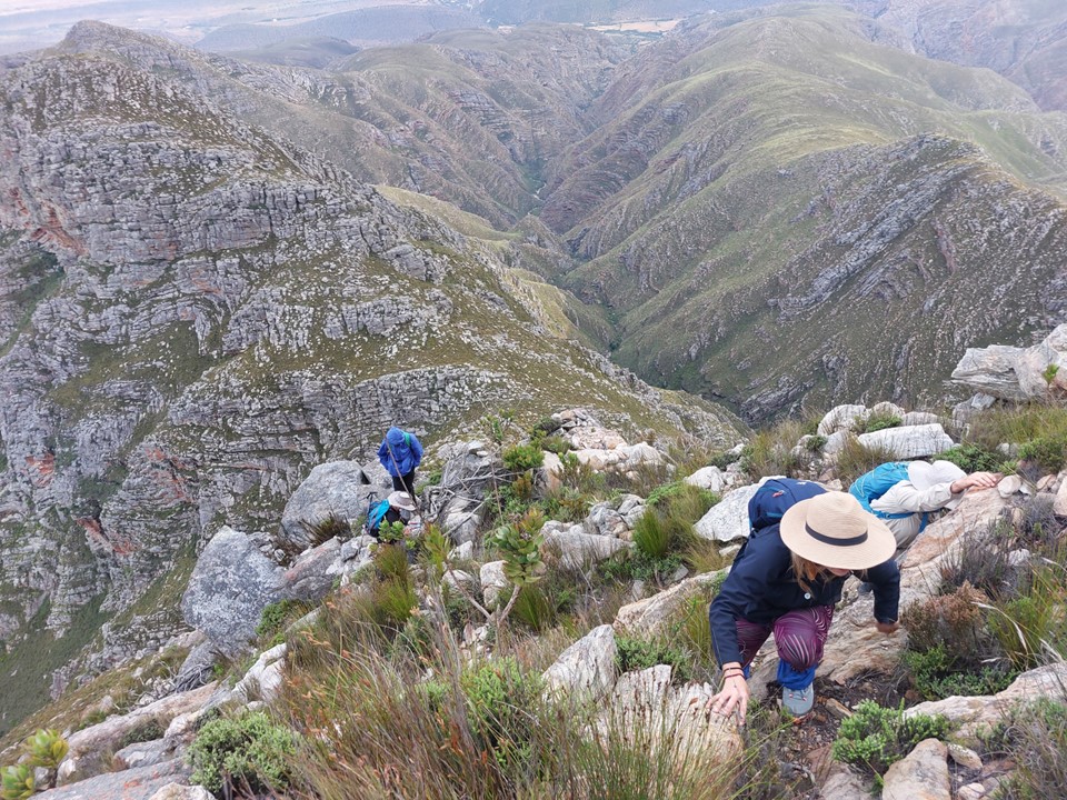 As we neared Tokoloshe Cave, the ground suddenly started getting more exposed. As is often the case in the Cape Fold Mountains, one has to walk on narrow exposed ledges where a fall could be serious. As Andrew would call it – the DFU Zone (Don’t Mess Up Zone).