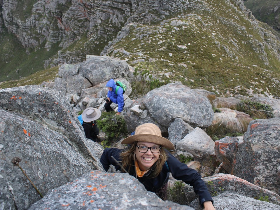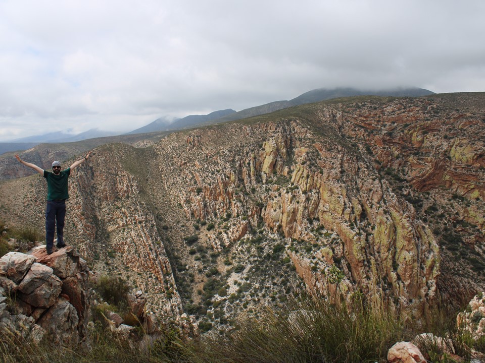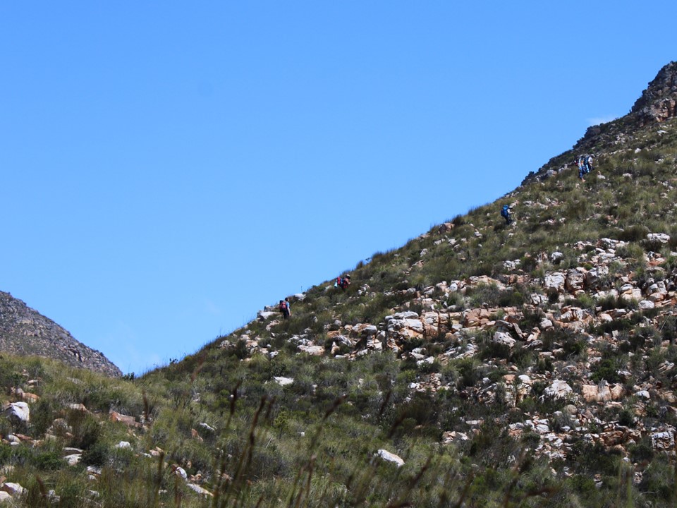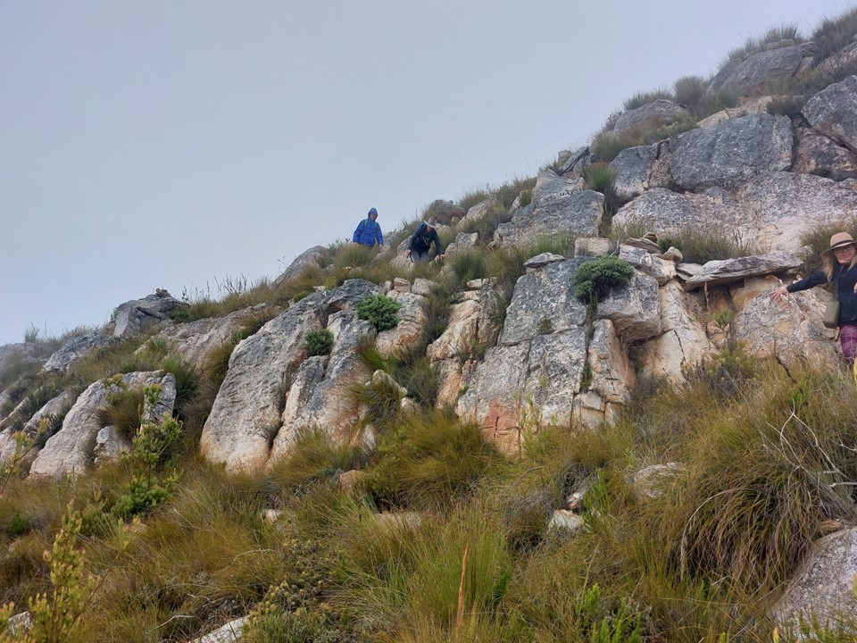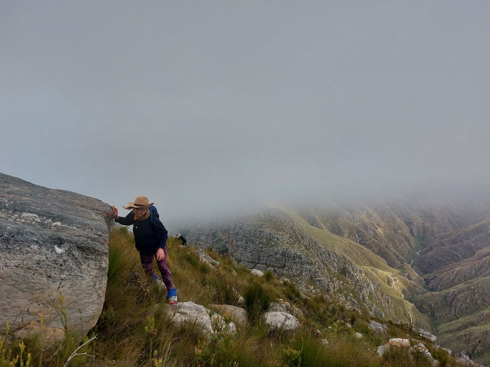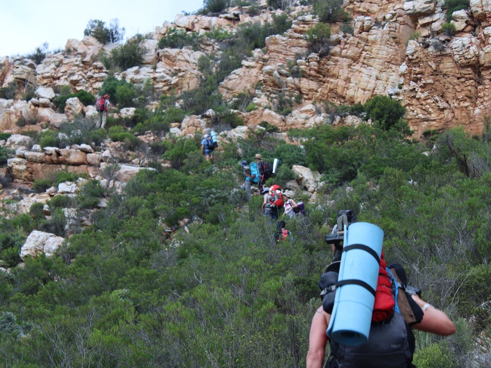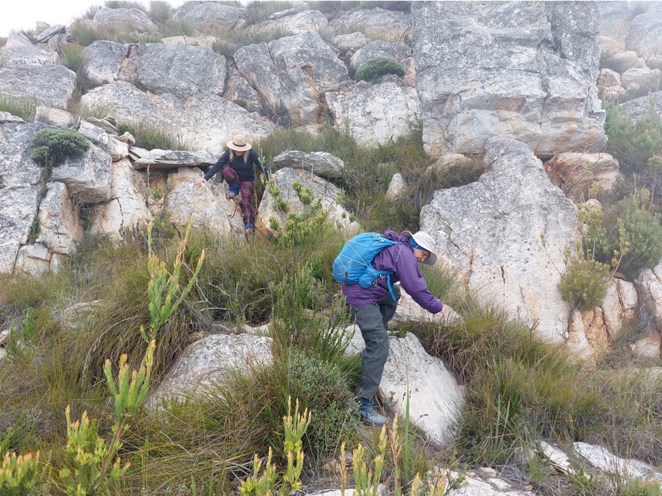 As we neared Tokoloshe Cave, the ground suddenly started getting more exposed. As is often the case in the Cape Fold Mountains, one has to walk on narrow exposed ledges where a fall could be serious. As Andrew would call it – the DFU Zone (Don’t Mess Up Zone).
