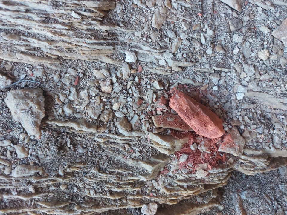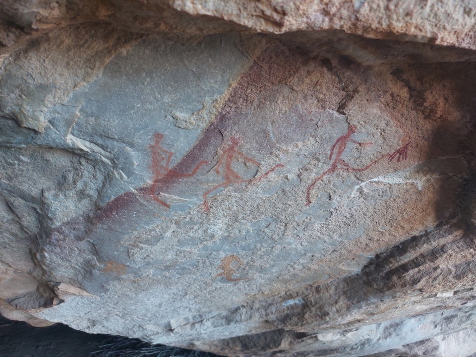 The cave has a few paintings. As the late Meridy Pfoetenhauer once told me – when in a rock art site, always look around for rocks that have been used as tools. I don’t know if the bright red rock on the floor had been used to make paint, but it certainly looks like it.