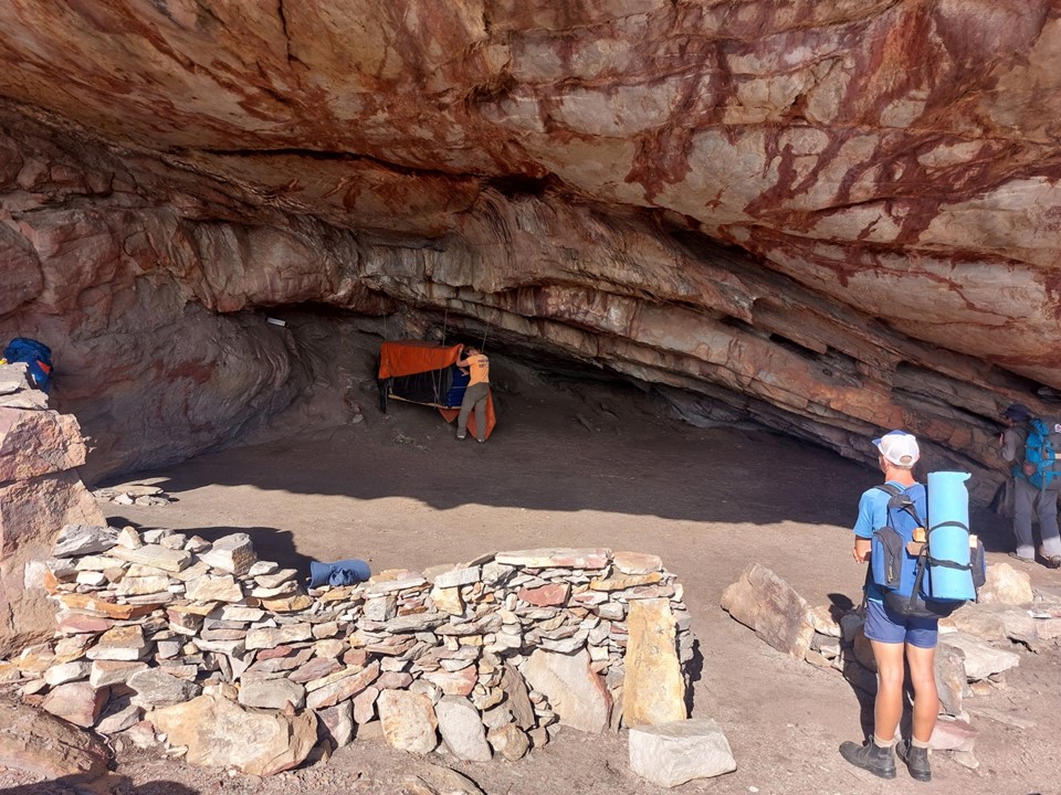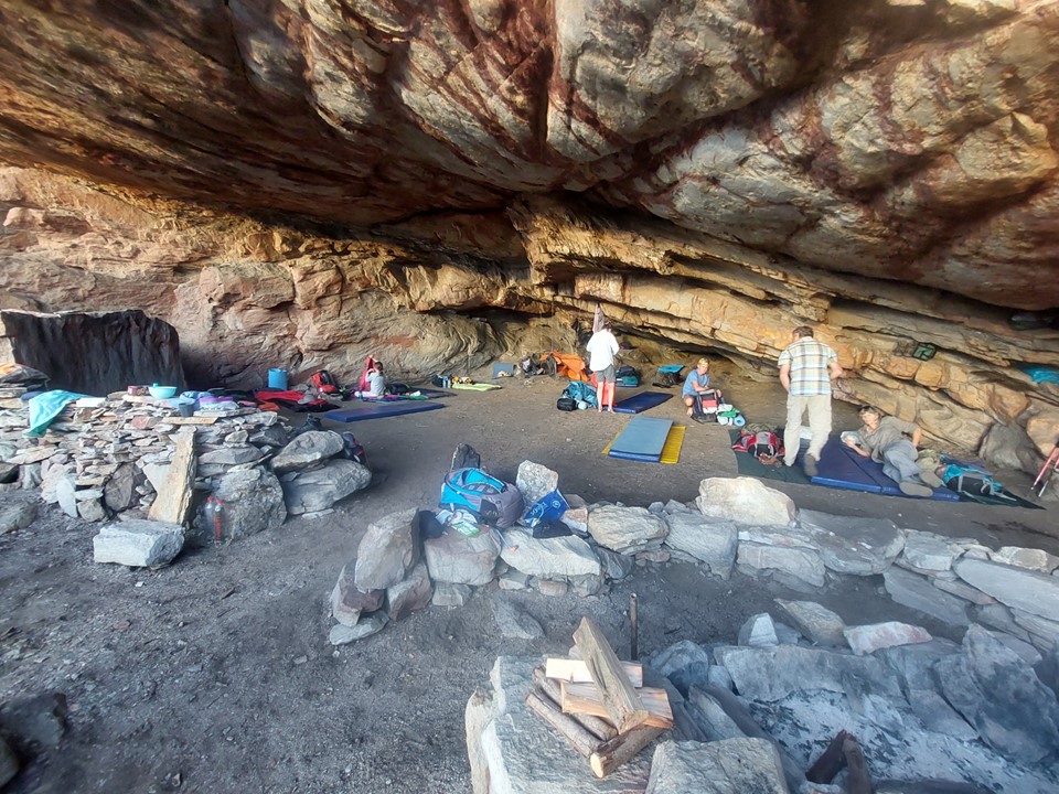 T’Numqoua Cave, meaning Mountain of Mist, is a large cave capable of comfortably sleeping 20, and possibly even 30 at a push. The primary problem is access to water – the nearest reliable stream is about 1km away, with a drip collection system installed in the cave being limited by the capacity of the tanks. A large team in the cave for two days could easily deplete those reserves quickly – so responsibly a team limit of around 15 makes sense for this. The cave itself is on MCSA property and staying here without permission from the club would be trespassing.