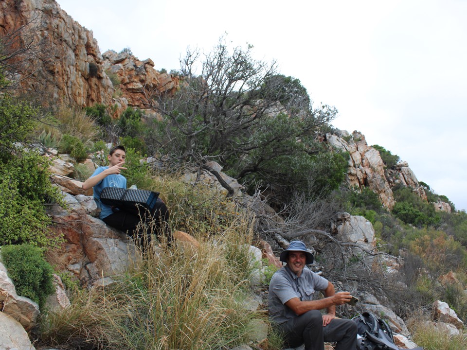 Luke wanted to explore the ridge above the cave, so I decided to join him. He is busy doing matric at present and is a strong runner and very competent on ground like this. He practically ran up the peak. With about 100m prominent and a height of 1400m, it isn’t a mountain summit by my definition – but still a great view point. Luke decided to collect firewood up there as well, just to add a bit of a challenge – or maybe to ensure no shortage of firewood.