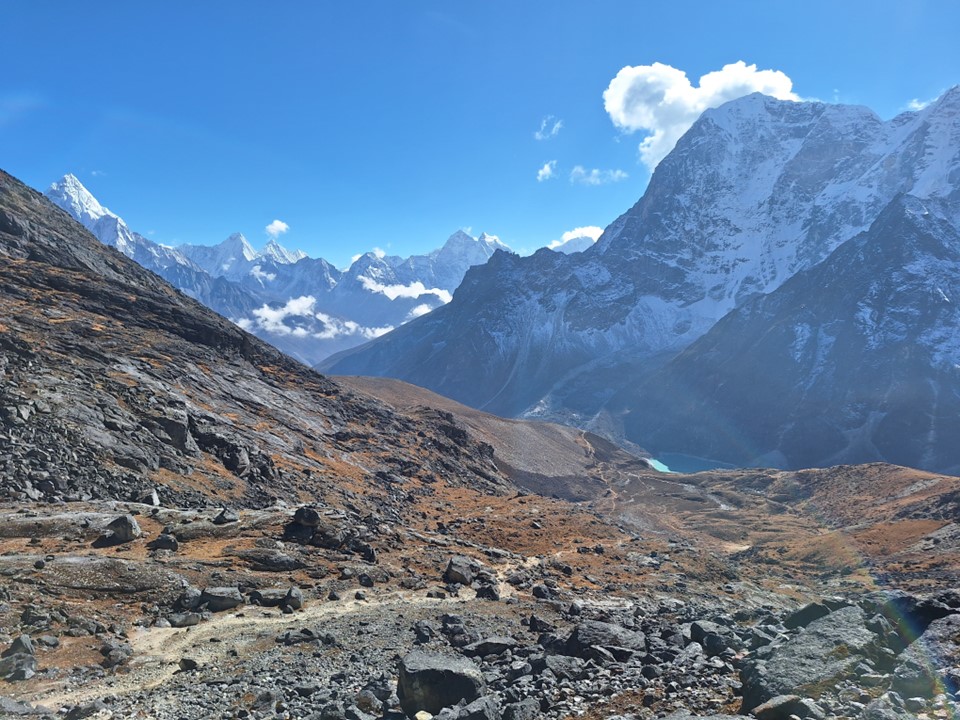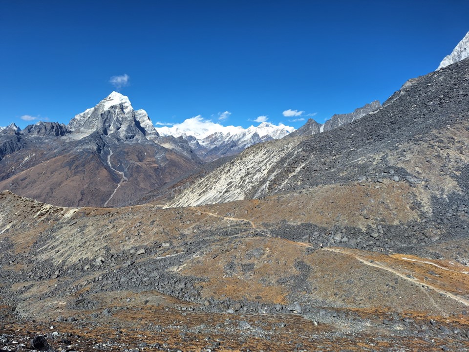 We took Thulka Pass – the route that takes one from the Lobuche/Dzongla trail to the Pheriche/Lobuche trail. I had not used the pass last year as I used Kongma La to get from Chuckhung to Lobuche, and then after heading up Kala Patthar and to EBC, I had hiked from Lobuche to Cho La. It is a short easy pass, but nice to finally do it – even if it put us back on the super busy EBC route.