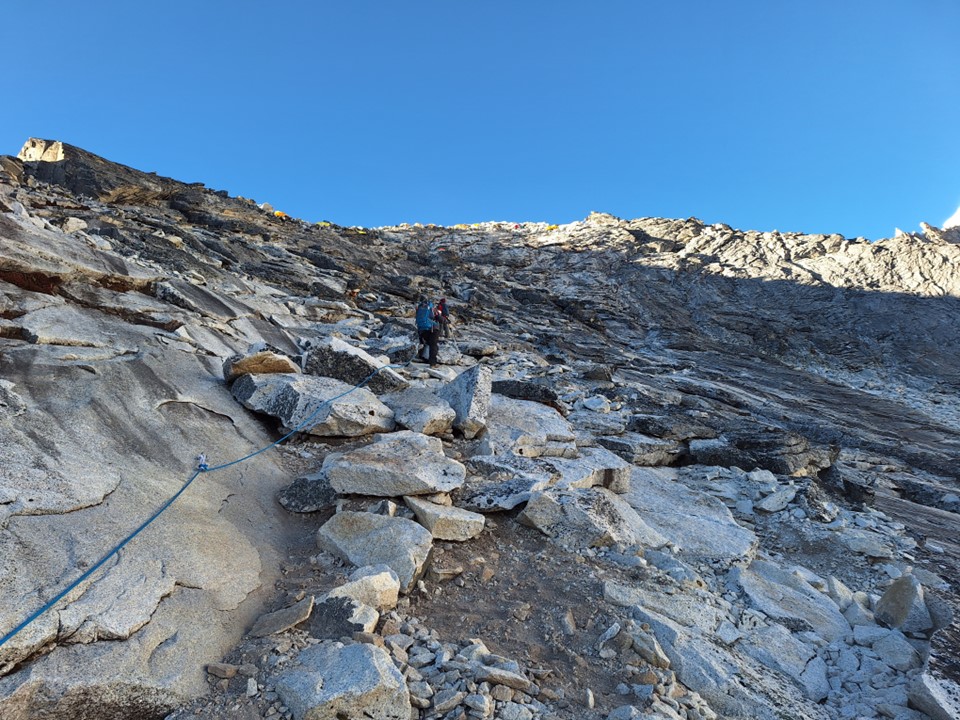 I eventually reached the start of the fixed lines. It was my first time climbing on fixed lines, and I now really understand why these are such a game-changer on the big mountains – in a healthy state I could easily walk this final section into basecamp, but in a sick and exhausted state, I was actually able to do the final section to camp one far faster than even the moderate steepness trails lower down.