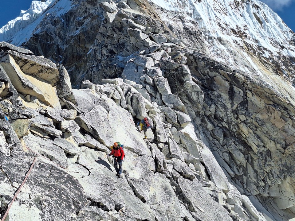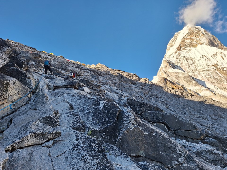I was initially concerned when I saw non-locking biners being used on the fixed lines, but I soon realised this was only on stabilisation points, all anchor points were correctly fixed. One has to remember that the people who fix lines up these mountains are some of the most experienced rope fixers anywhere on the planet, and deaths due to incorrectly fixed ropes are rare.