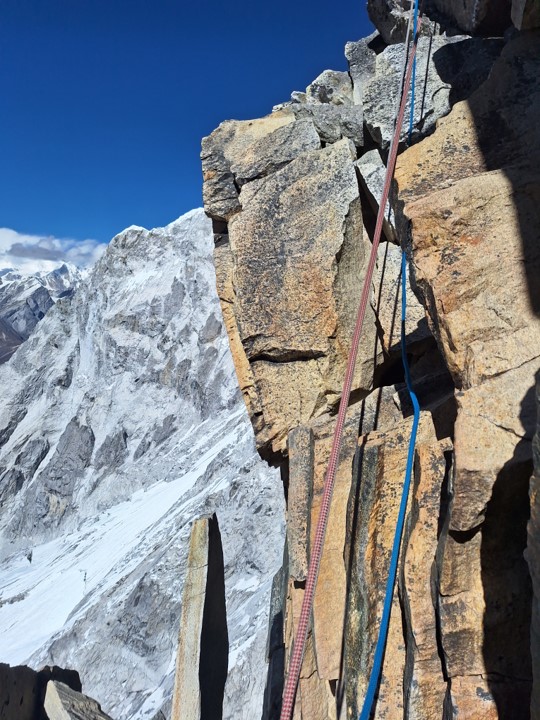 By this point I was really not feeling well. I was spending as much time resting as moving, and I had given up on trying to climb the rock, instead pulling on the ropes for basically all but the easiest moves. I had hoped to free climb the Yellow Tower (the technical crux of the route), and here I was aiding class four terrain. At one of the stops Pasang checked my blood oxygen, and the SATS reading was 71 – which was a bit scary.