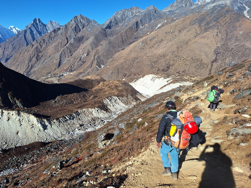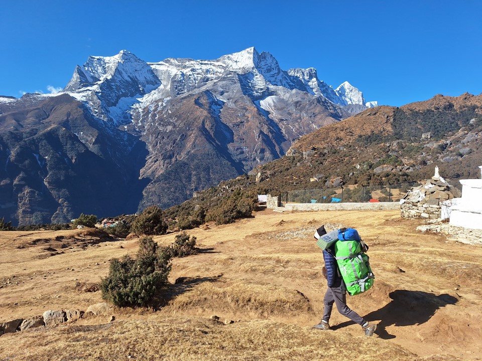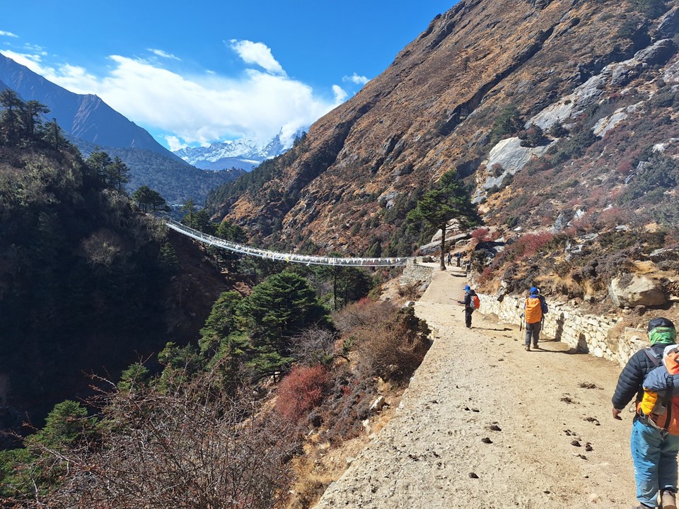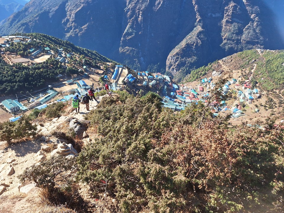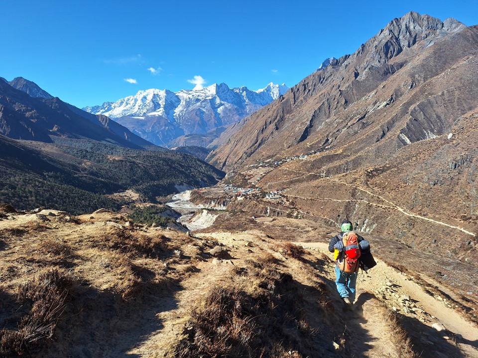 By the time of my meeting, we were still 8km from Lukla, and finding reliable signal wasn’t easy. I eventually found a ledge I could stand on with signal that held for most of the time. These three meetings took close to two hours, and I was very grateful for Chuldim’s patience during this. The good news was that it was agreed that I didn’t need to rush home to sort everything out. It was Friday afternoon, and I had to do the expedition debrief at the Tourism Office in Kathmandu before I could fly home – failure to do so would get me a lifelong ban from ever returning to Nepal, so it wasn’t a simple case of racing back to Kathmandu and moving my flight.