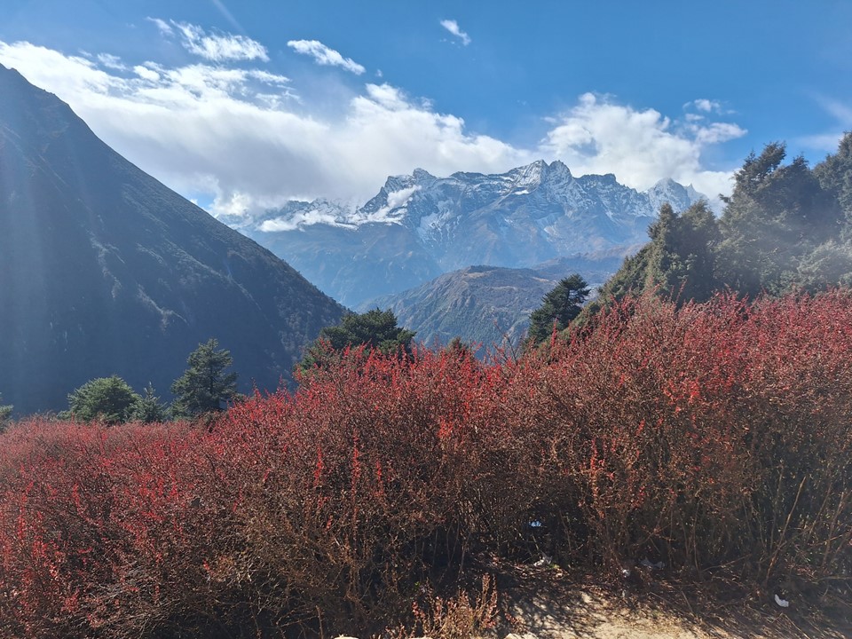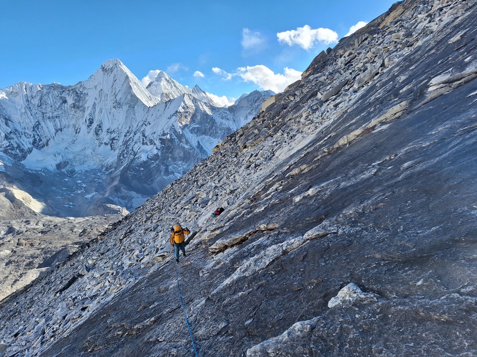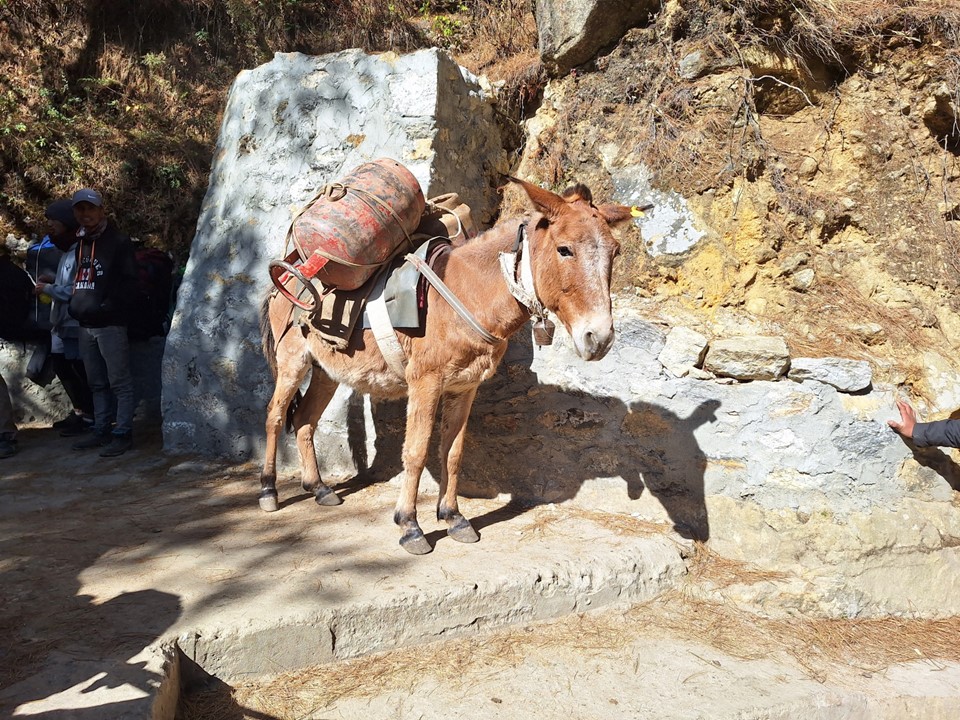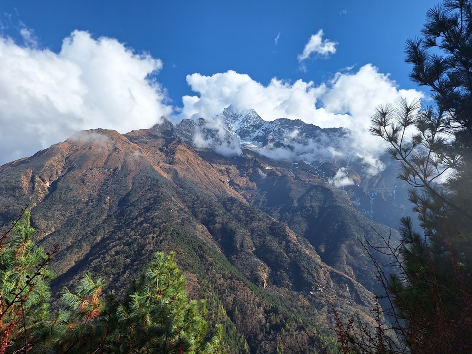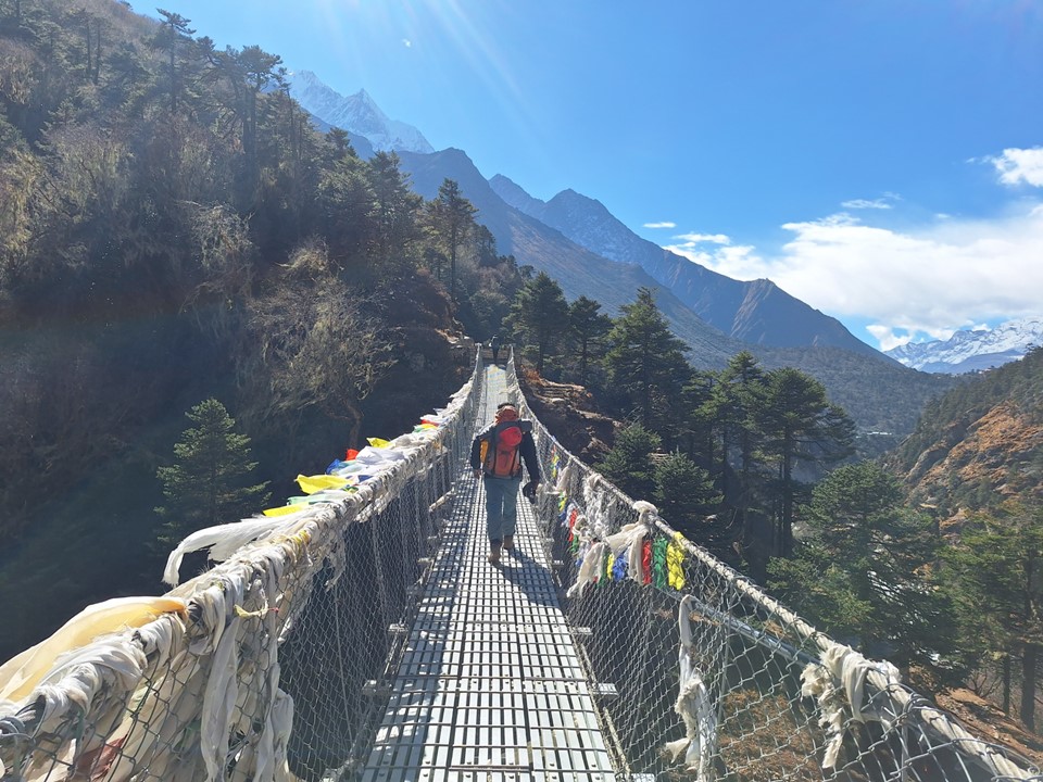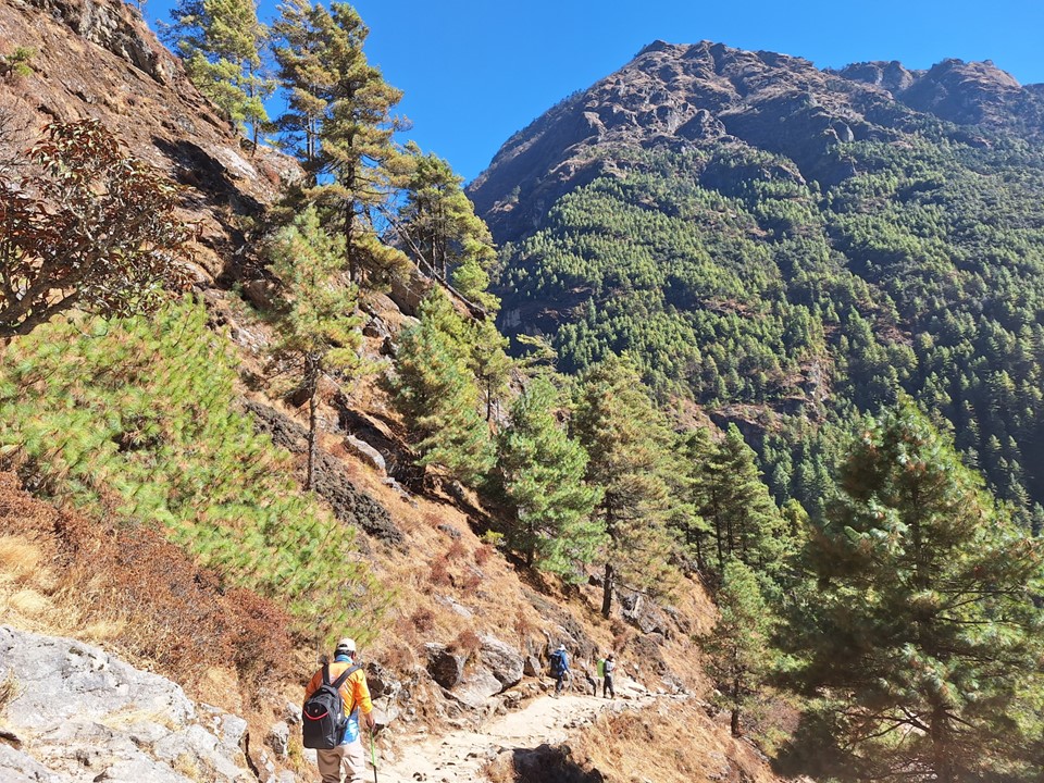 By the time of my meeting, we were still 8km from Lukla, and finding reliable signal wasn’t easy. I eventually found a ledge I could stand on with signal that held for most of the time. These three meetings took close to two hours, and I was very grateful for Chuldim’s patience during this. The good news was that it was agreed that I didn’t need to rush home to sort everything out. It was Friday afternoon, and I had to do the expedition debrief at the Tourism Office in Kathmandu before I could fly home – failure to do so would get me a lifelong ban from ever returning to Nepal, so it wasn’t a simple case of racing back to Kathmandu and moving my flight.
