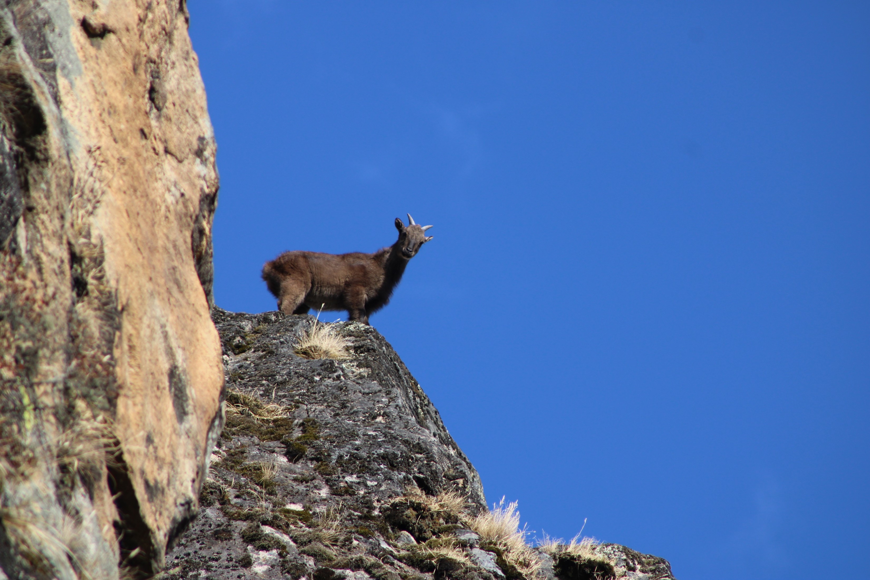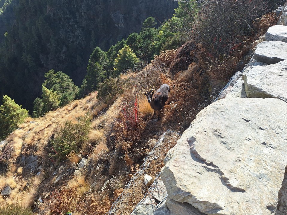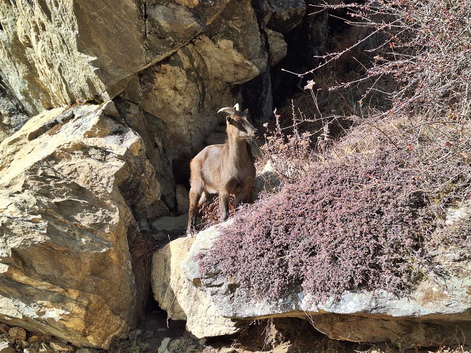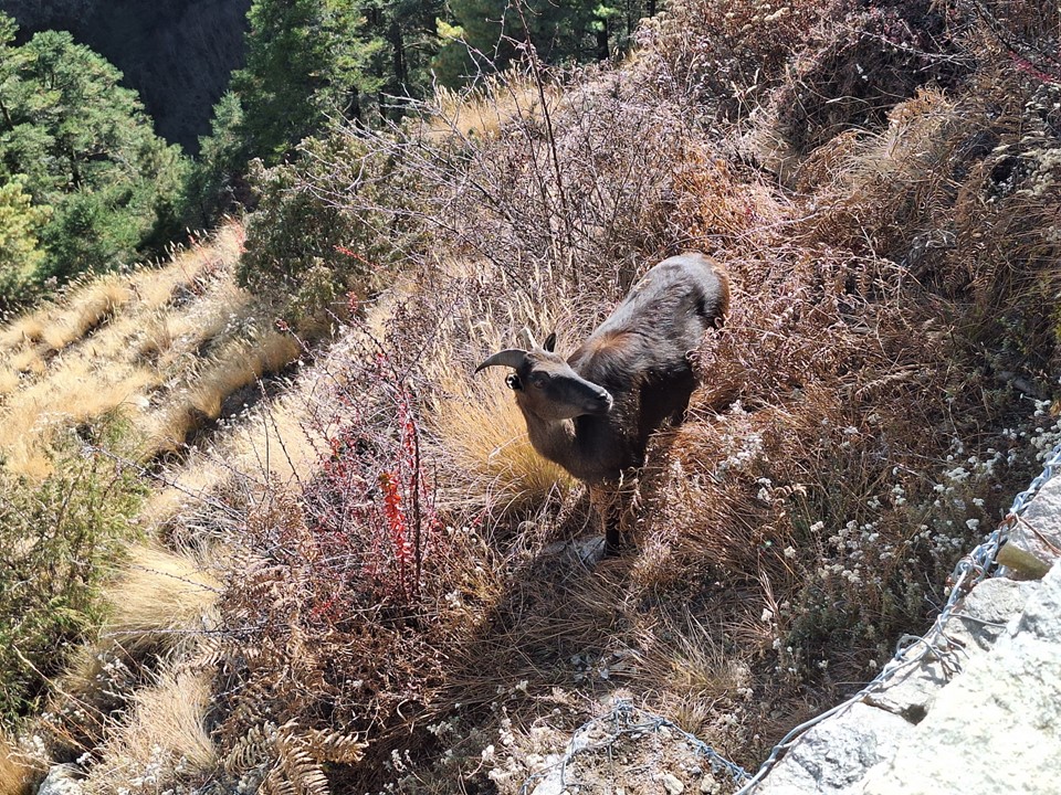 As we neared Khumjung, we saw some mountain goats. We had seen one near Phortse on the way up, but this time it was a fair number of them, and right next to the trail. I got out my DSLR and my large lens to get some photos, although we actually got very close to one of them.