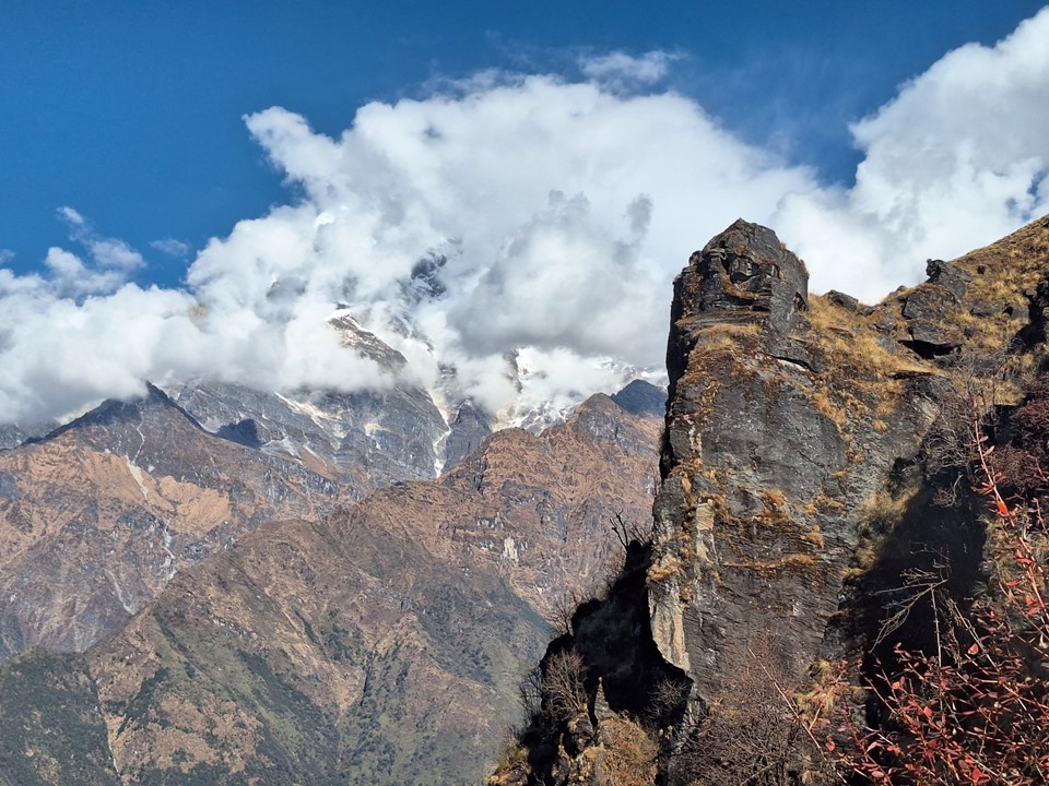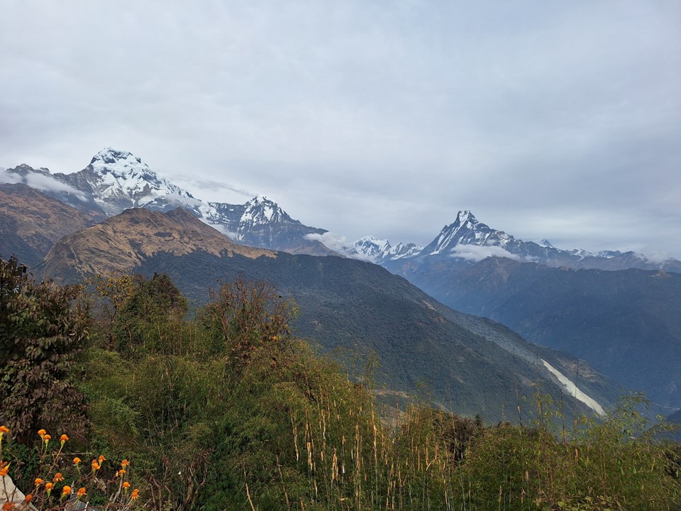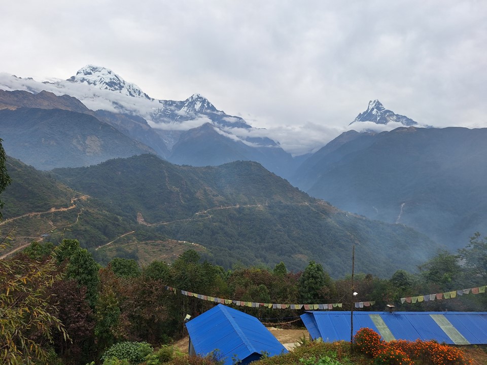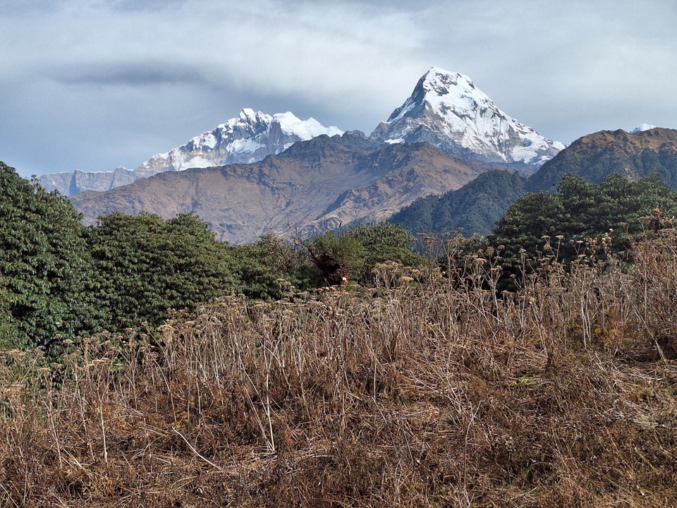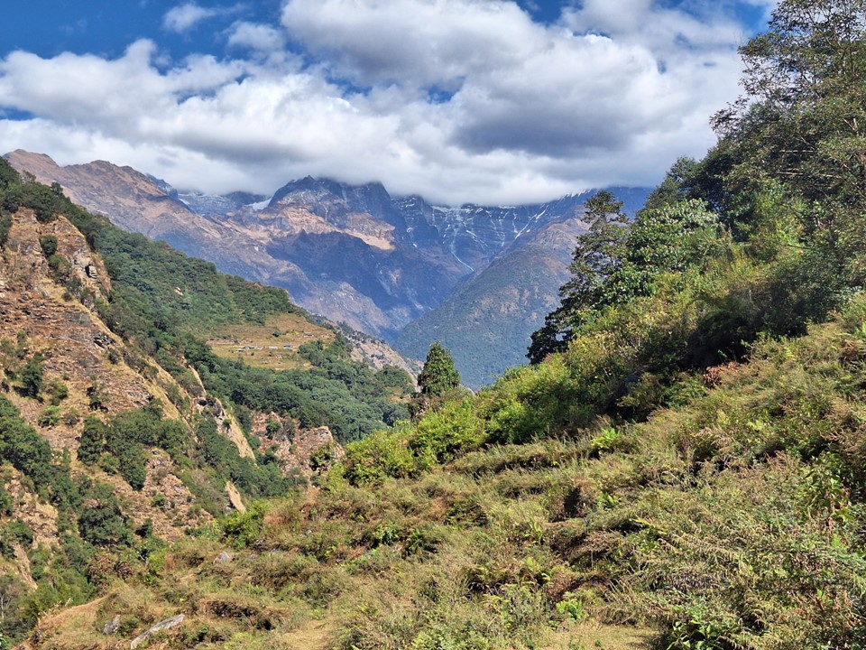 As you near Ghandruk, you go down into a deep valley and then climb steeply on the other side. Once you’ve crossed this ridge, the main mountains come into sight again.