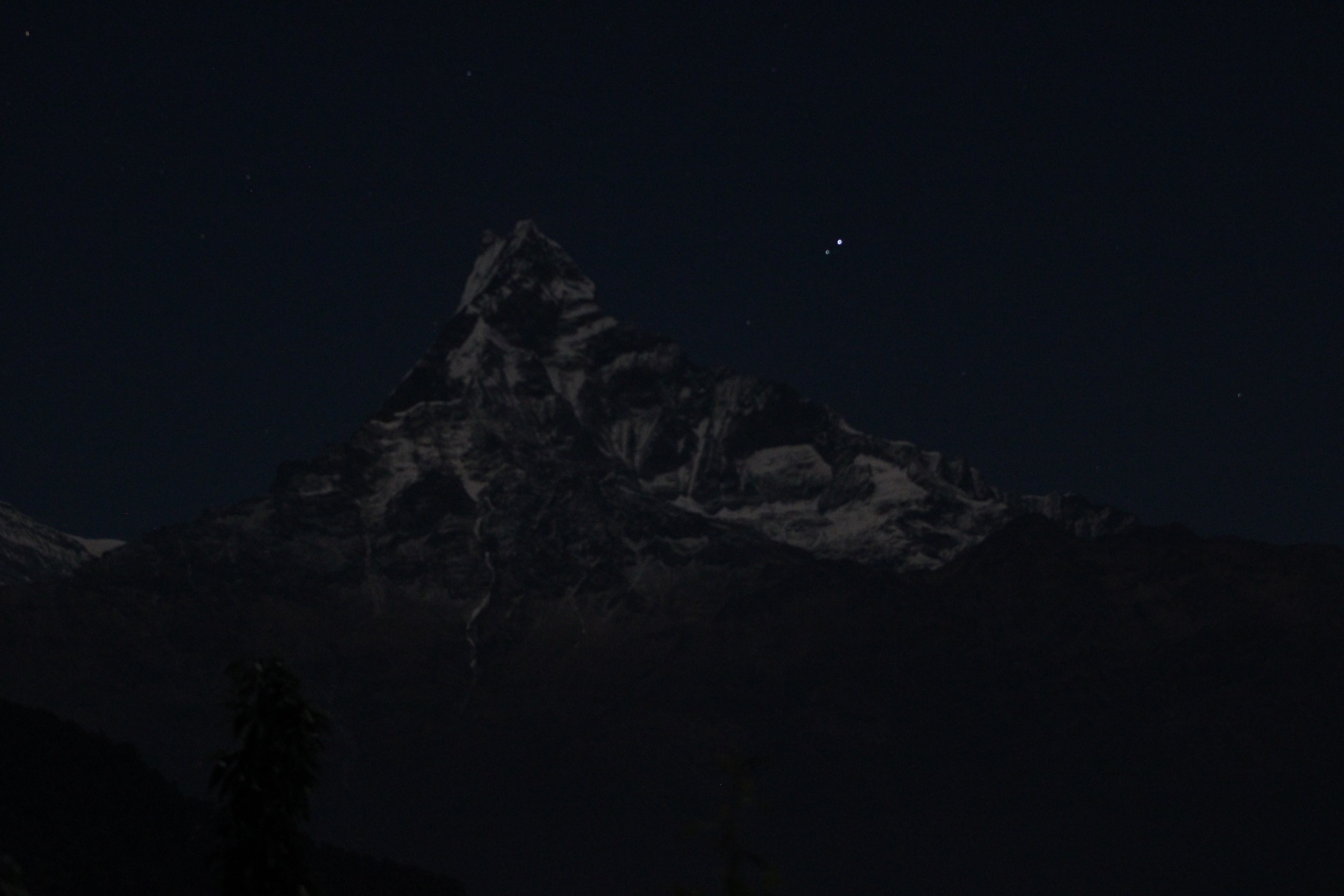 The clouds had largely cleared, but some clouds that remained around Machhapuchhare were being illuminated by the moon that was yet to rise from behind the mountain. The mountain itself was an ominous silhouette with a shroud of bright clouds around it. It almost looked like a giant rising above me. Machhapuchhare is an impressive mountain in any conditions, but being so close to it and directly under it under these conditions was another level. The local population believes it to be the home of certain gods, and when you see it in these conditions, you can understand why they believe this. It was simultaneously the most intimidating and yet spectacular sight I have ever seen. One of those moments that is difficult to repeat and impossible to capture.