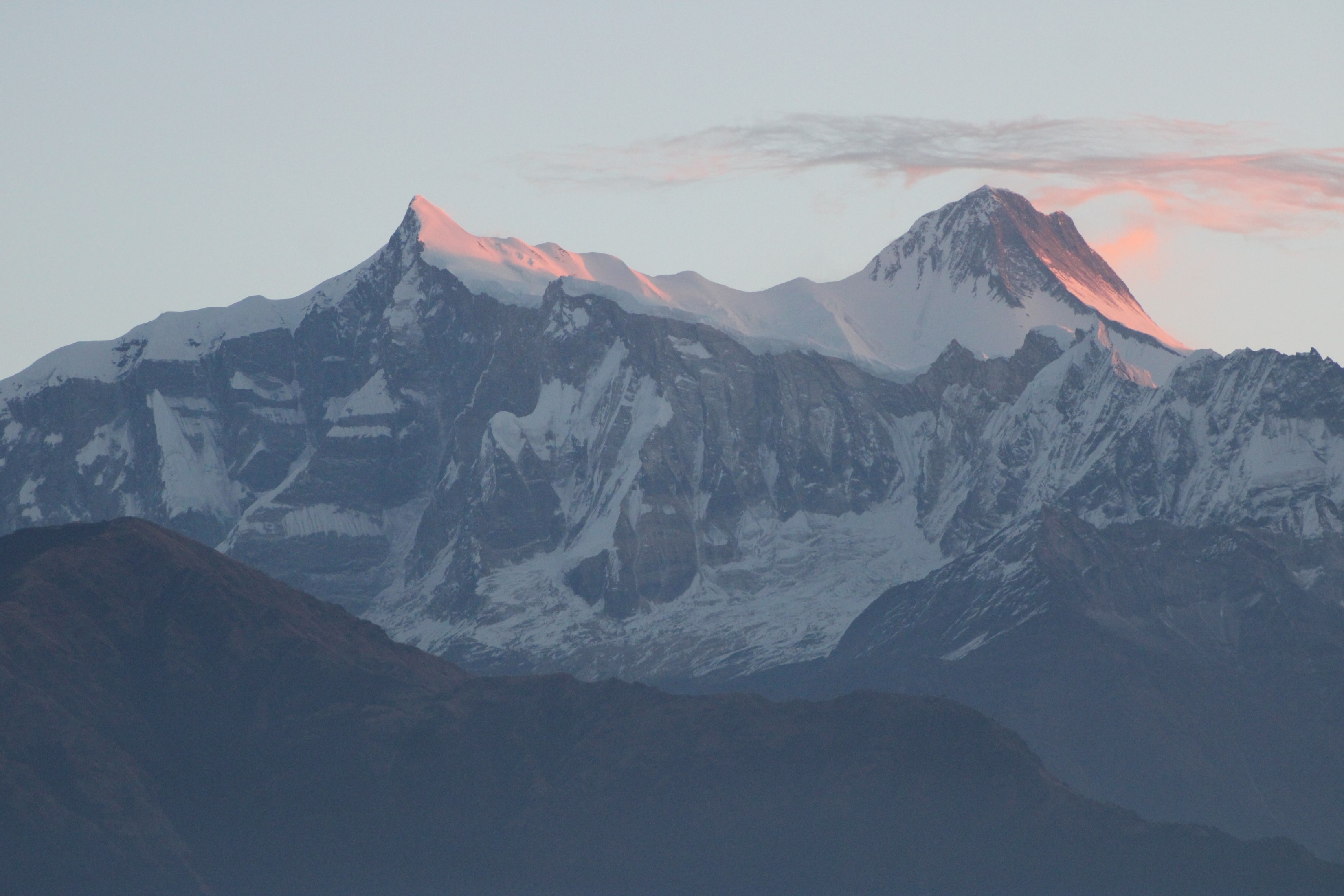 The above photo is Annapurna II (left) and IV (right). Annapurna IV is a subsidiary summit of II, but II is the 16th highest mountain on earth, or the 2nd highest 7000er, after Gyachung Kang next to Cho Oyu in the Everest Region.