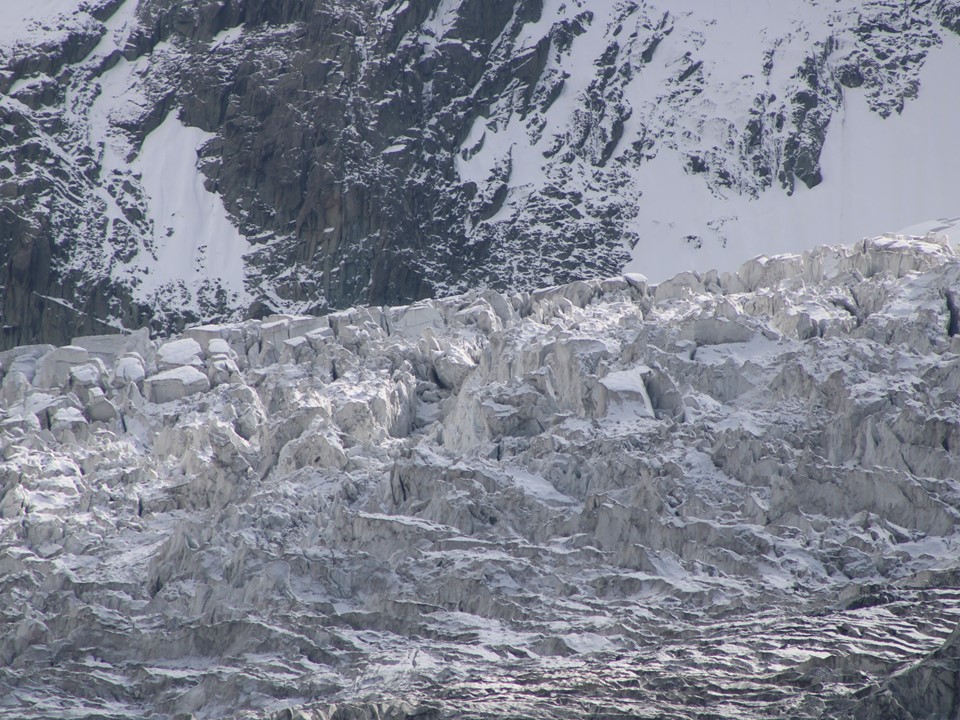 Basecamp is on a narrow flat section between the glacier and a ridge. Tents are generally placed far from the ridge – and based on the amount of loose rock on the ground below the ridge, the reason why seems pretty obvious.