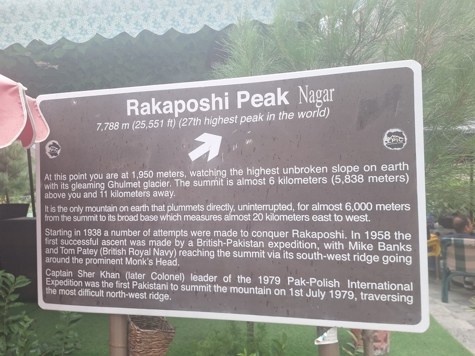 There are many definitions of mountains, but I personally rank Rakaposhi as the 26th highest, not the 27th highest as generally accepted in Pakistan. The reason is that Gasherbrum III, at 7952m, only has 461m (5.7%) topographic prominence, meaning that I don’t recognise the claim of it being the 16th highest mountain, thus upgrading Rakaposhi to 26th. As for the claim of the longest uninterrupted downhill, I think Nanga Parbat has a better claim to that.