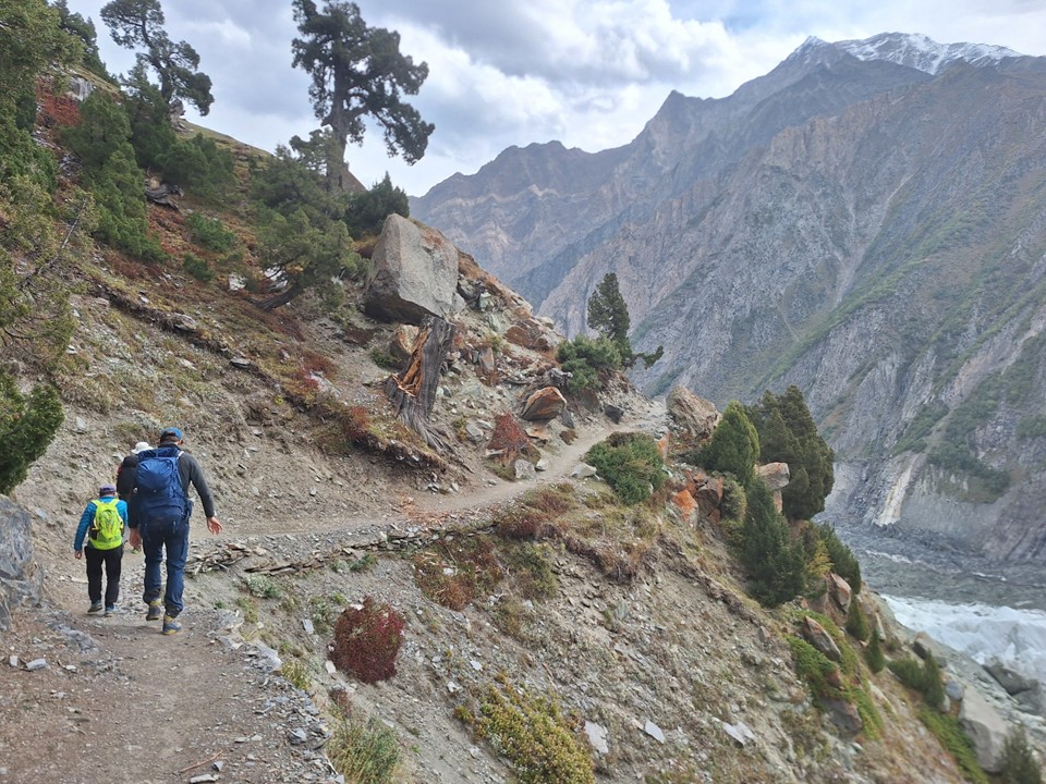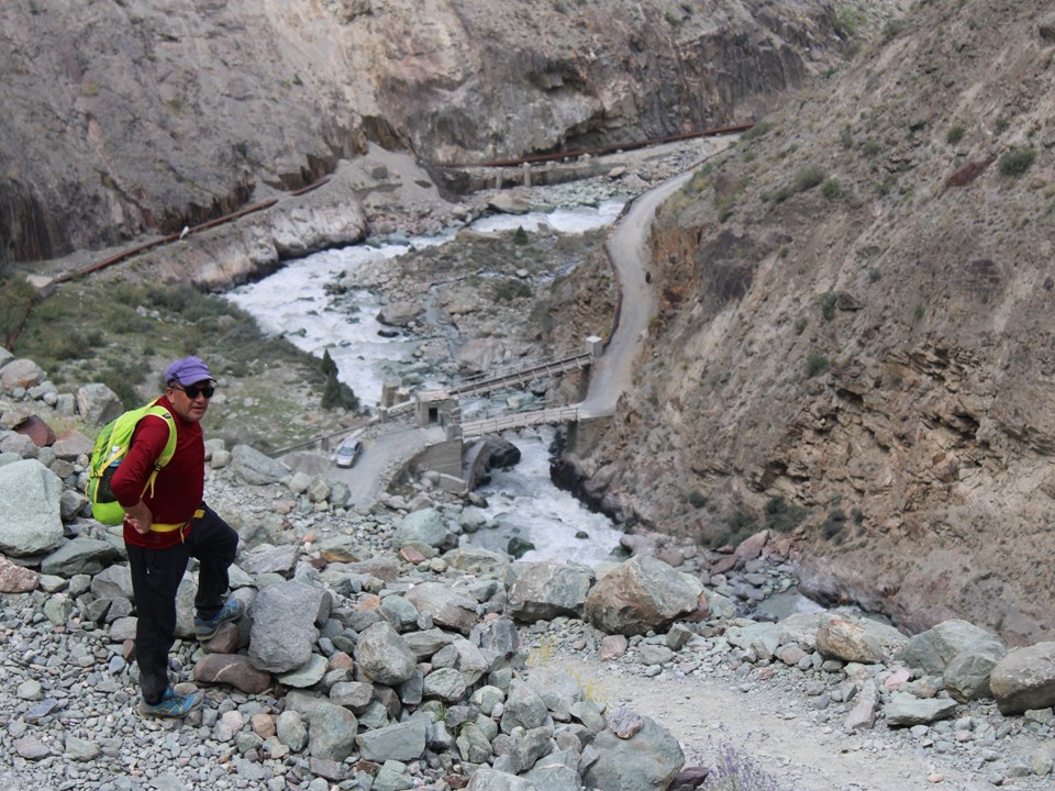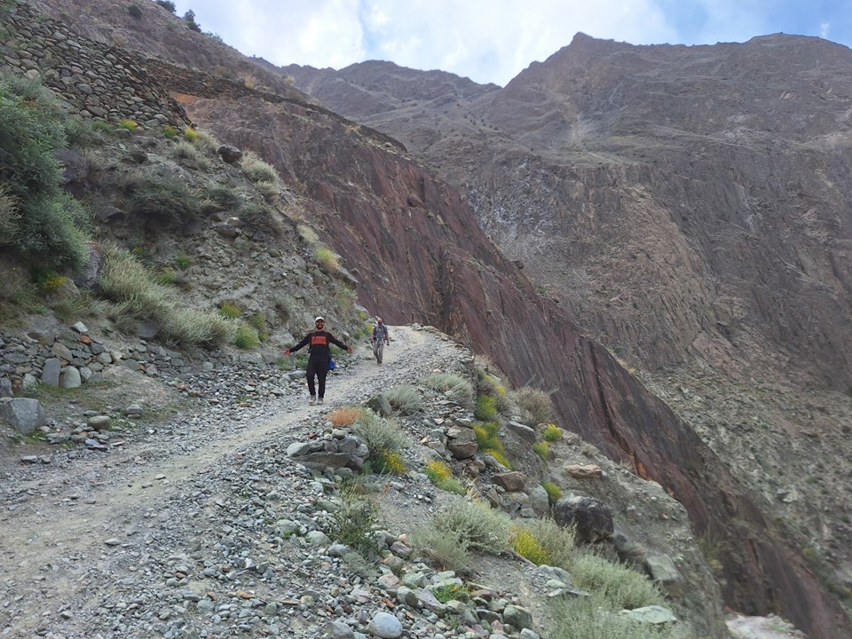 The trail starts by crossing the Minapin River, which comes off the Rakaposhi Glacier – and you can feel it is glacial as you walk over it. The icy wind on an otherwise hot morning was refreshing!
