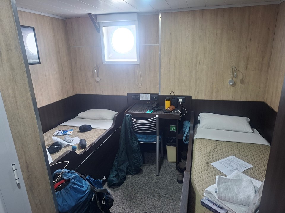 We eventually boarded. It was snowing, and I wasn’t wearing my waterproof pants, so I was cold and wet by the time I got on the ship, but luckily it was heated inside. The bartender, Fabian, checked me in. They take your passport – officially for safekeeping, but more likely as collateral to ensure you settle your bill before disembarking. This was in the T&C before signing up, so I knew it was coming.