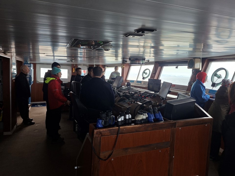 The following morning, it was immediately obvious that we were no longer in open waters. Conall suggested we go and watch to see if we can get the sight of first land.