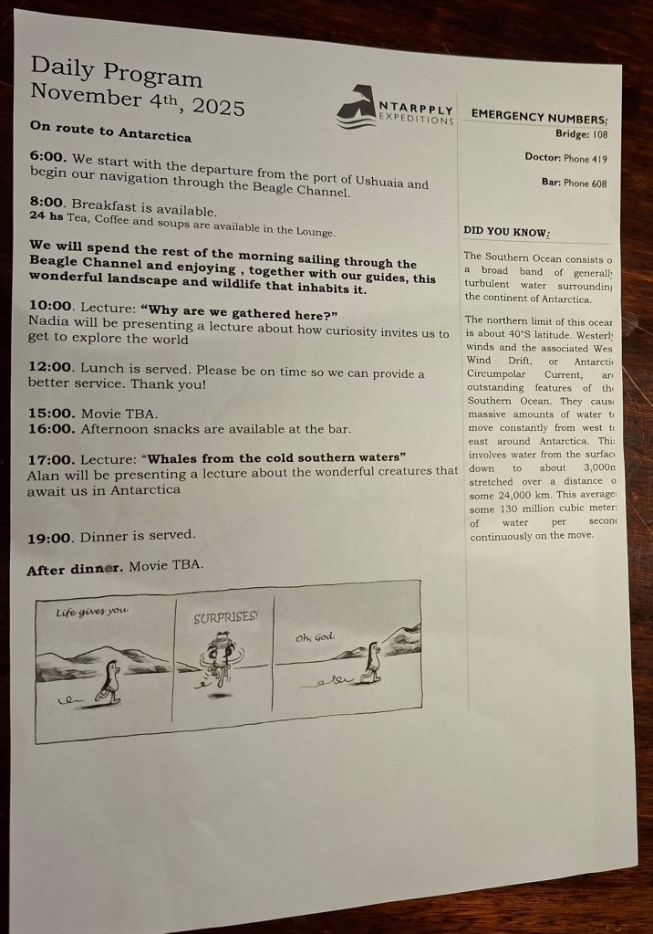 By the end of this first day, I would have met the three people I would spend most of my time on the ship with. I sat next to Jess (Australian) at the welcome speech, Rivu (Indian born, living in USA) was Marco’s roommate, and Conall (Irish) joined the same table as me at dinner. I noted that the four of us represented five of the continents – while we had set off for the sixth and were heading to the seventh. It is great when things work out this way! Conall and Rivu had been to six continents, so Antarctica would be their seventh. Jess and I were both on four.