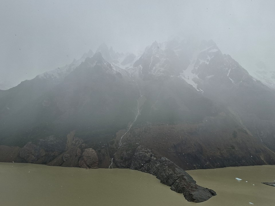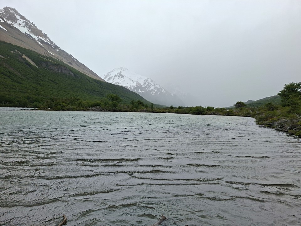 I reached the lake in very strong winds. There were waves on the lake, and I was actually pushed off balance a few times. I had nearly fallen into the river on a bridge crossing a bit earlier due to a gust of wind. Not fun. Naturally Cerro Torre was hiding in the clouds once again.