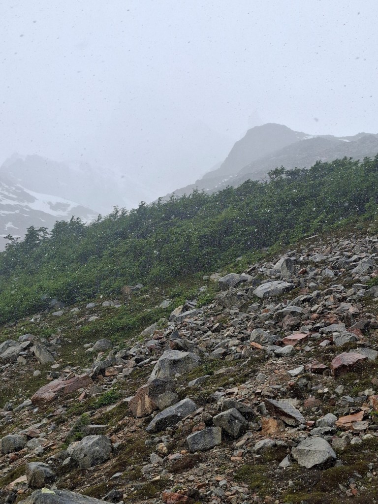 The trail connecting the routes was fairly easy, going past a few lakes along the way. It was getting very windy, with occasional snow. I had been trying to keep my pace up, knowing I still had a long way to go – although, by this point I knew I’d finish well ahead of sunset. The upside of very long days so far south!